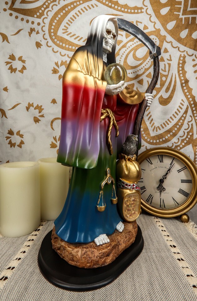 Large 16.75"H Rainbow Holy Death Santa Muerte Holding Scythe Globe W/ Owl Statue