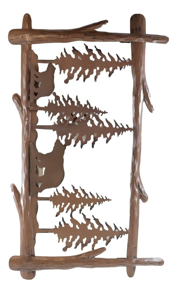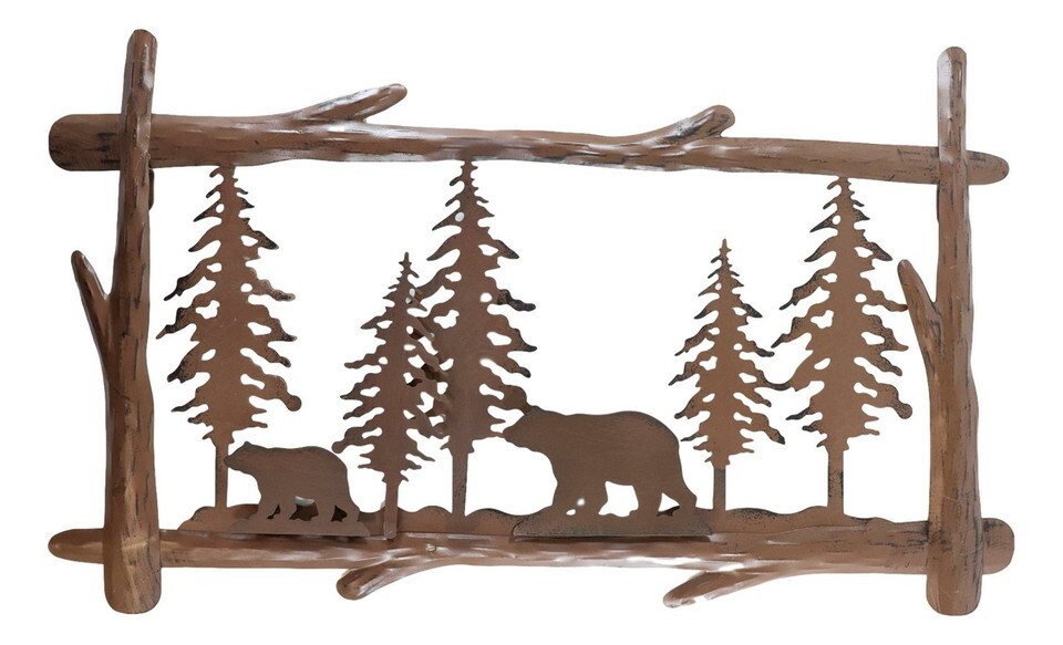 ? The 2D wall art is cast in rustic brown color, starting with borders in the shape of pine tree trunks and brances. Inside the 'frame' lies sporadic pine trees with a mother bear and her cub sauntering the forest trail. It is charming and gorgeous!