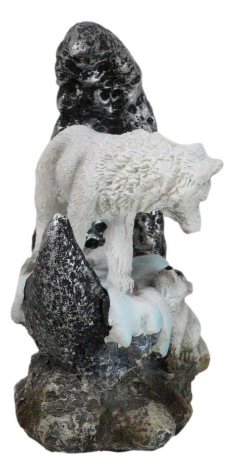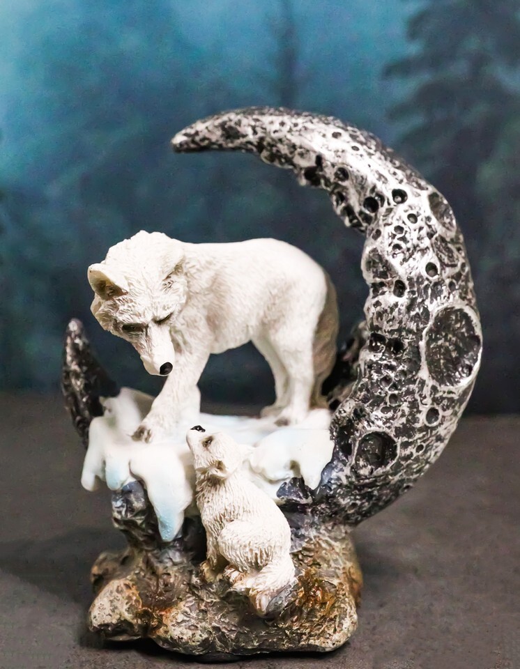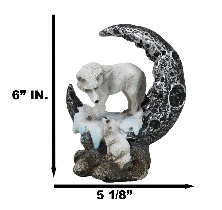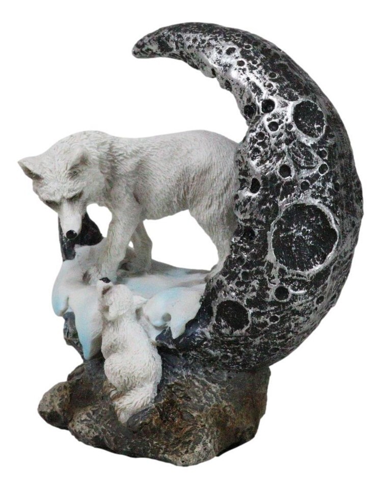 Winter Snow White Wolf Mother With Pup By Snowy Crater Crescent Moon Figurine