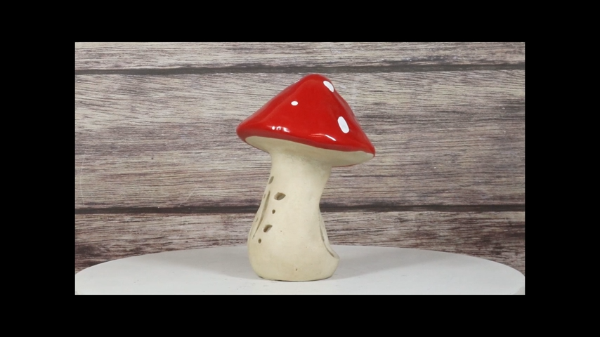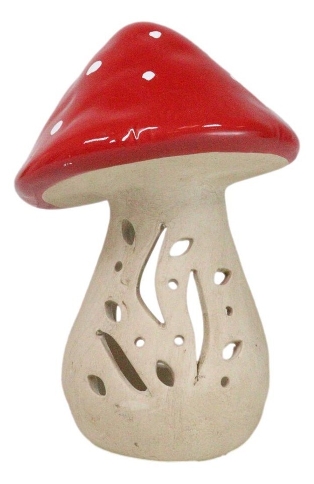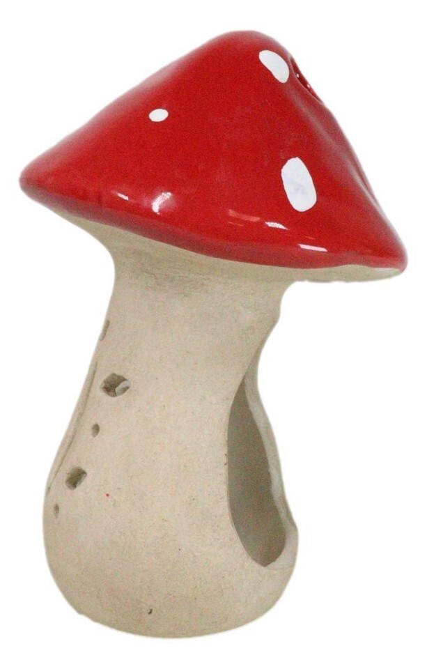 ? This is a ceramic mushroom votive holder that features a filigree cut-out on its stem, casting light and silhouette on its surroundings when a candle is lit.