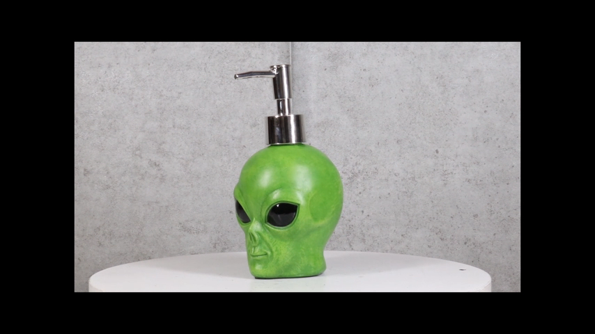 ? This Green Alien bathroom liquid soap pump dispenser is made of designer polyresin, hand painted and polished individually.