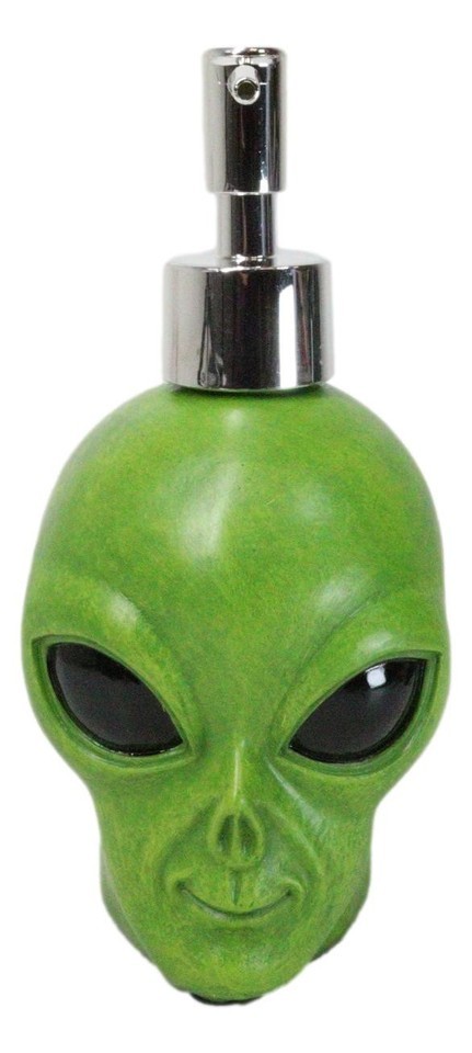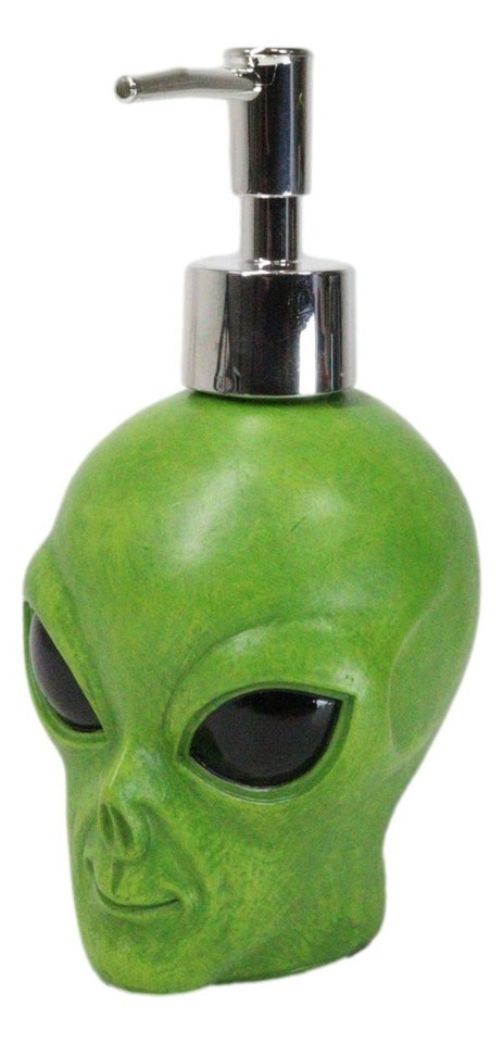 ? Add a touch of intergalactic flair to your bathroom with the Green UFO Outer Space Colony Extra Terrestrial Roswell Alien Head Liquid Soap Pump Dispenser! This quirky dispenser features an eye-catching alien head design inspired by the Roswell mystery, with vibrant green detailing that's sure to spark conversations. Functional yet fun, it's the perfect way to bring a little extraterrestrial charm to your space.