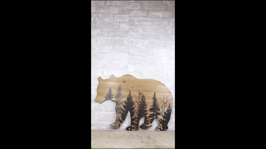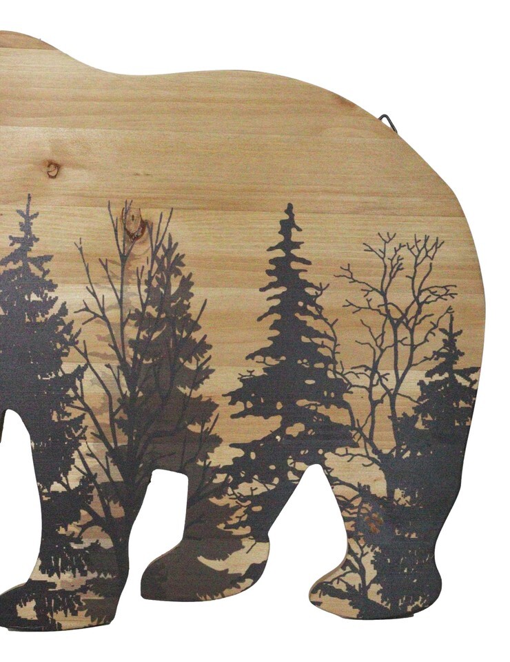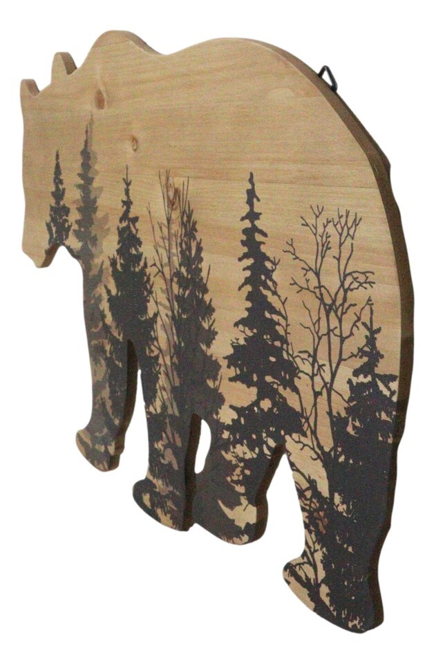 ? Bring the rugged charm of the wilderness into your home with our Black Bear with Pine Trees Forest Silhouette Wooden Plank Wall Decor. This striking piece features a detailed black bear wooden cutout with a pine trees forest silhouette. The rustic design and natural wood grain enhance the wild and free spirit of the great outdoors, making it a perfect addition to any cabin, lodge, or nature-inspired decor.