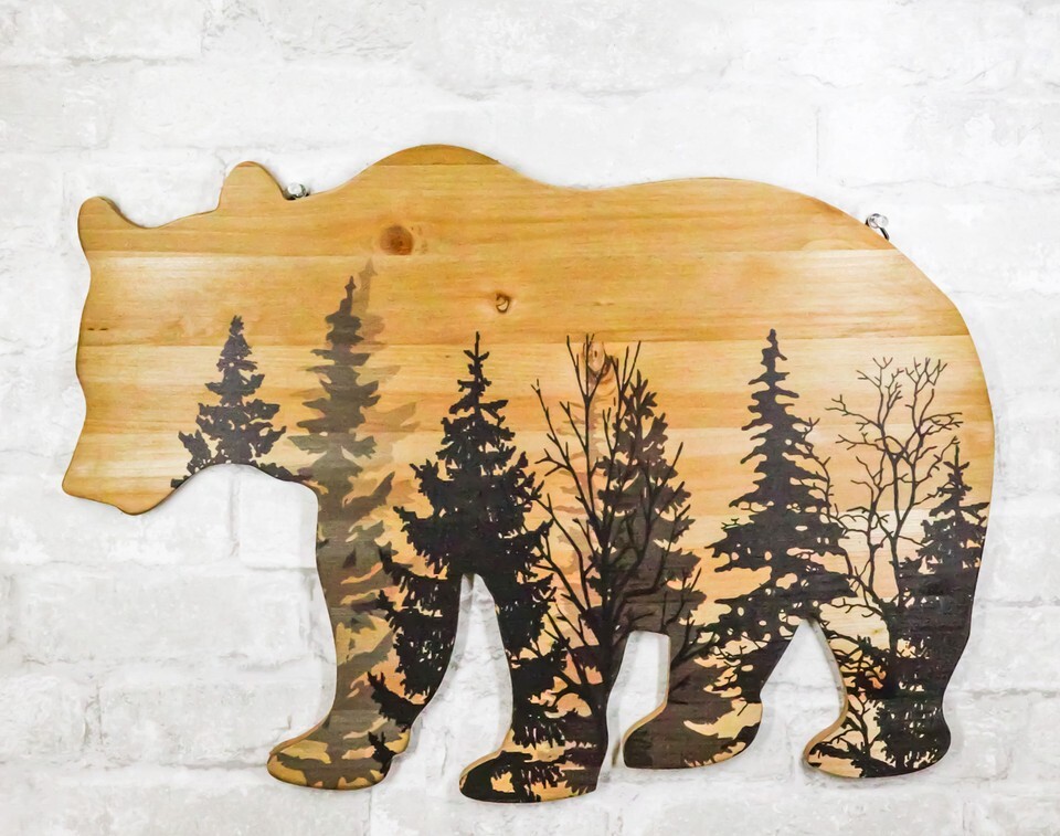 Western Black Bear With Pine Trees Forest Silhouette Wooden Cutout Wall Decor
