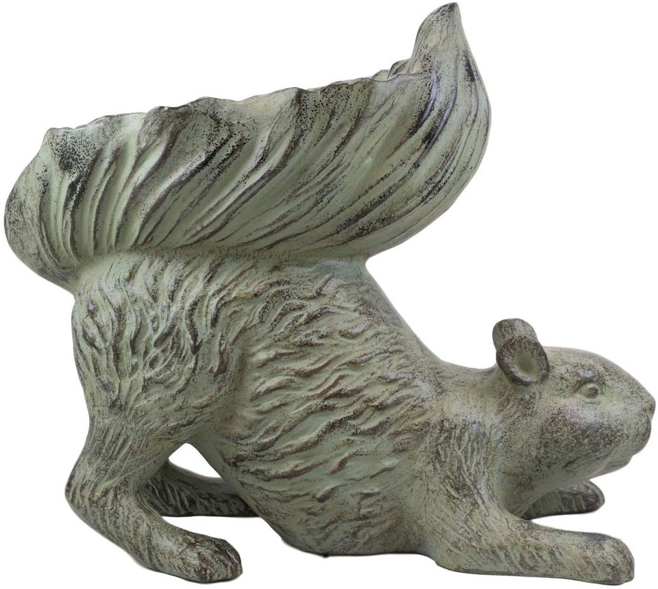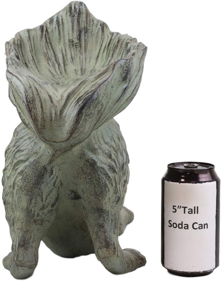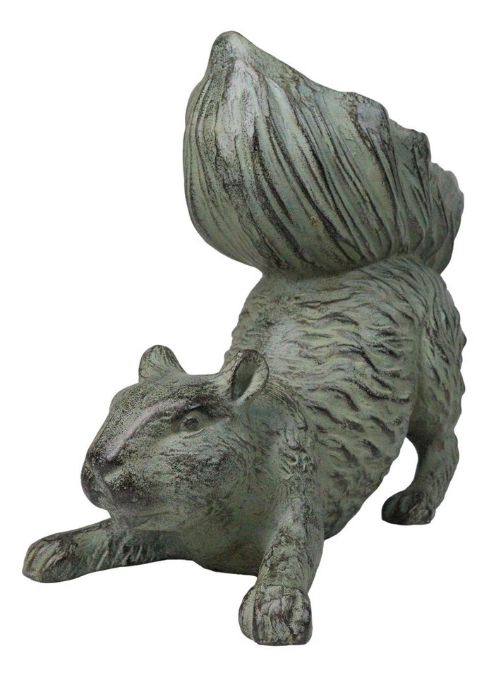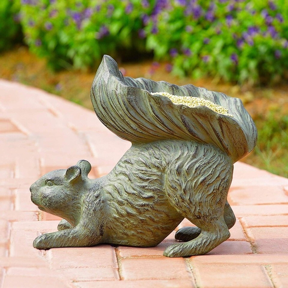 This adorable crouching squirrel sculpture will be the focal point of your outdoor space and the envy of your neighbors! Crouching playfully with his bushy tail pointed to the sky, the sculpture's tail is designed to take the shape of a bowl for you to put bird feed in. Your garden will come to life as birds of all kinds visit to keep the squirrel busy!