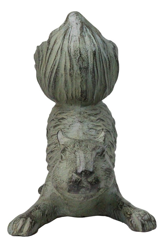 This Bushy Tailed Squirrel Bird Feeder Statue is made of weather resistant aluminum and is ideal for both indoor and outdoor display. Each part is cast using either the lost wax sand casting method. Artisans take the various cast parts and carefully weld them together before sanding and polishing them by hand. The high quality premium sculpture is then painstakingly hand painted and layered in verdigris green patina finish.