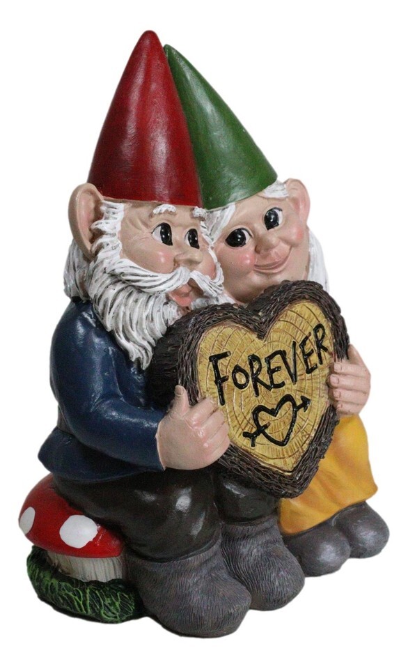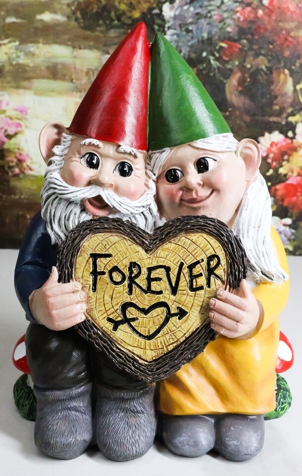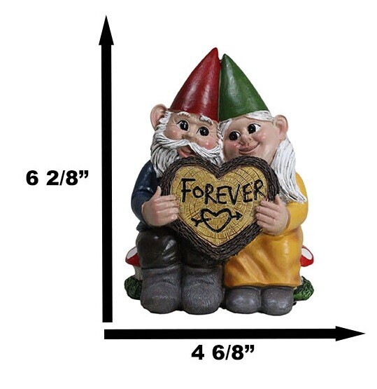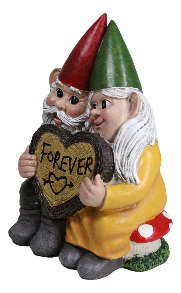 ? Home is where the gnome is. Let our sweet, snuggling gnome couple add a heartfelt touch to a garden, or even a mantel. Molded from designer resin, our happy hobbits statue is carved in fine detail from the cute toadstool mushrooms to their facial features, and painted in full pastel colors. It's a gift full of woodland charm and fairytale magic. The gnome couple holds an inspirational sign that says "Forever (And A Love-struck Heart And Arrow Symbol)".