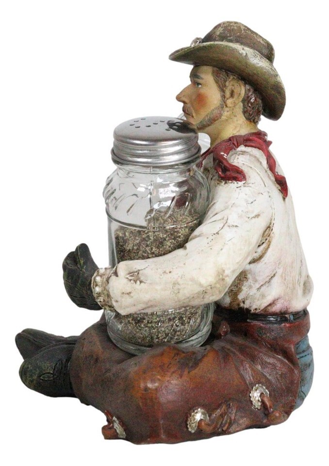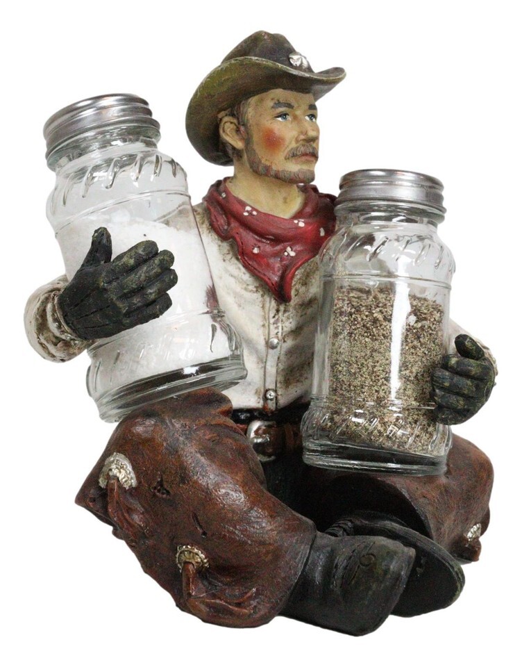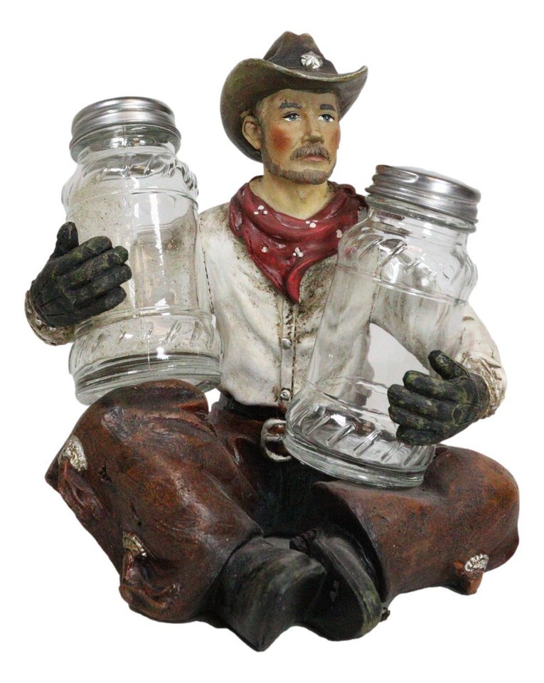 ? Giddy up and saddle up cowboys with this western salt and pepper shakers holder! This friendly cowboy has his full look on; starting with his hat, button down shirt, scarf, jeans and chaps. In his hands you can set 2 glass shakers for your favorite condiments.