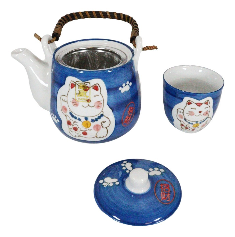 Ebros Japanese Maneki Neko Lucky Charm Cat Blue Tea Pot and Cups Set Serves 4