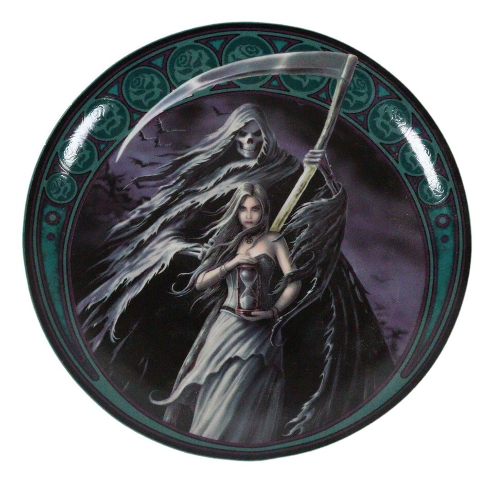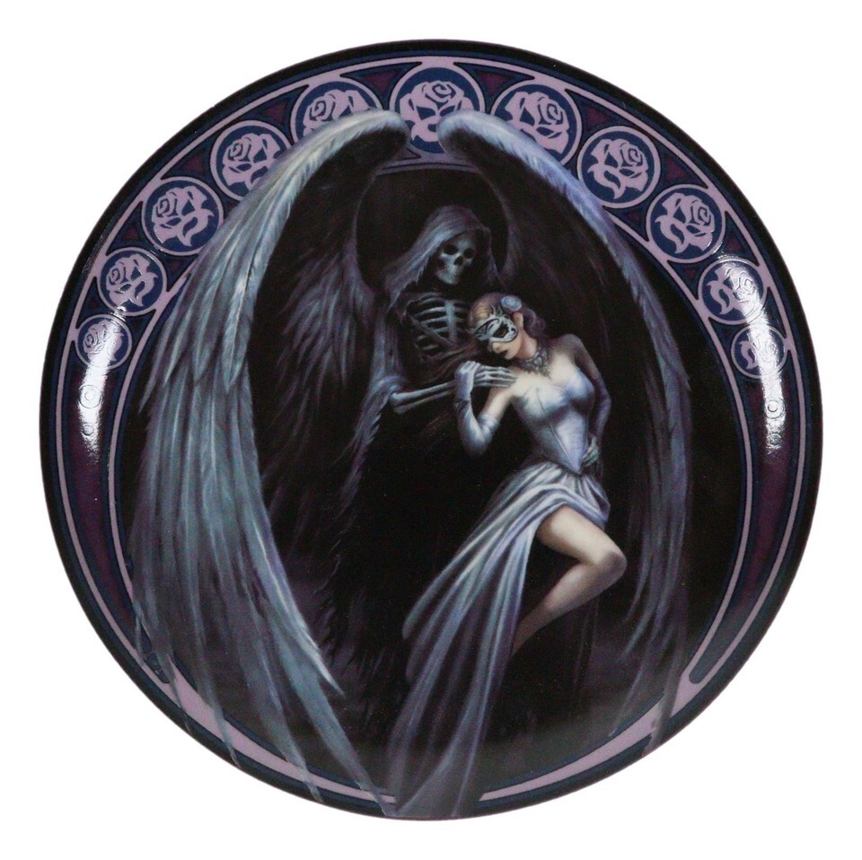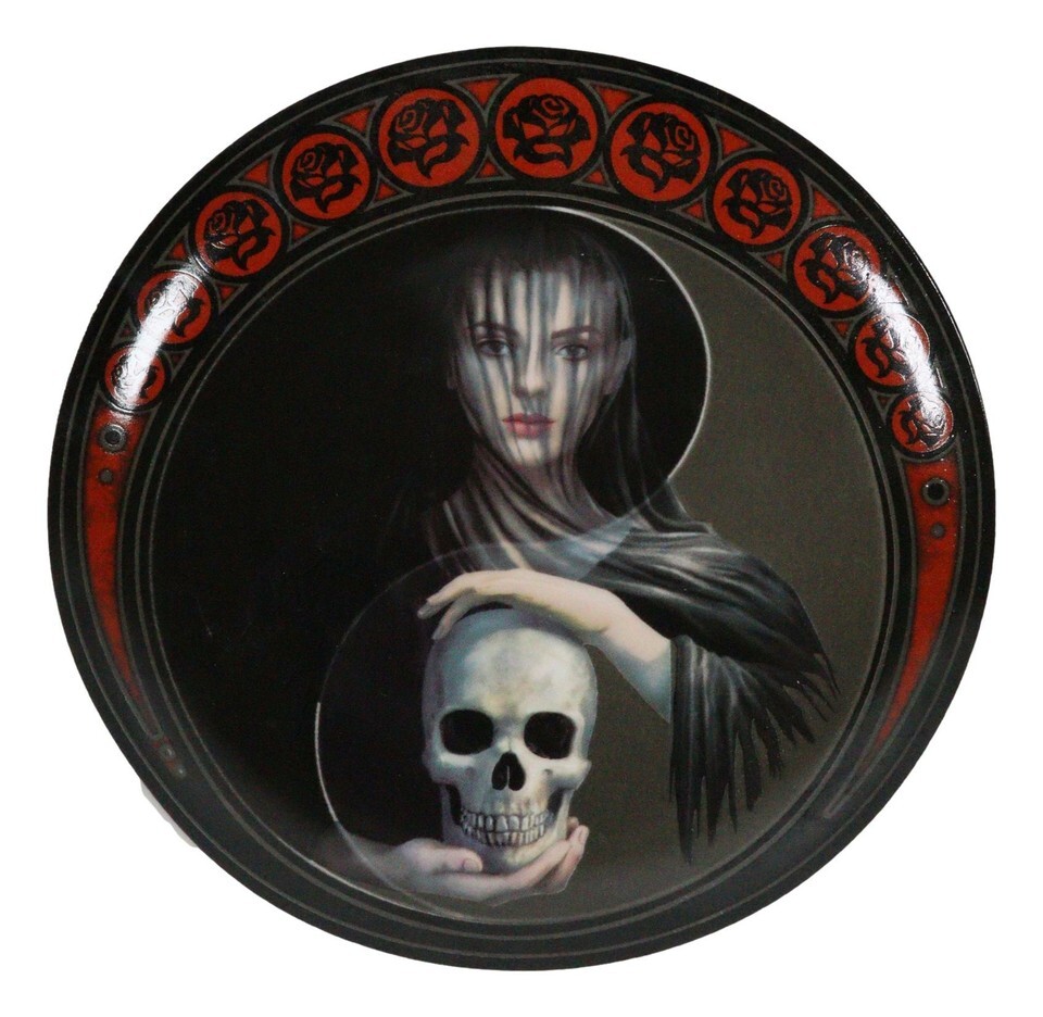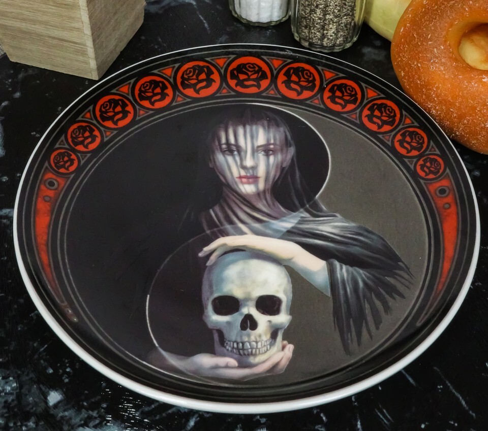 ? These Anne Stokes servewares consist of 4 designs; Summon The Reaper, Forever Yours, Beyond The Veil and Dance With Death. These imaginative enchanting designs paint pictures of a young beautiful damsel in love with Death. Burning with love for Death, she is as close as she will ever be to be consumed by it. A perfect reminder of the intricate and delicate dance between life and death that ensnares us all. They are perfect for your appetizers, small salad servings, desserts or what have you!