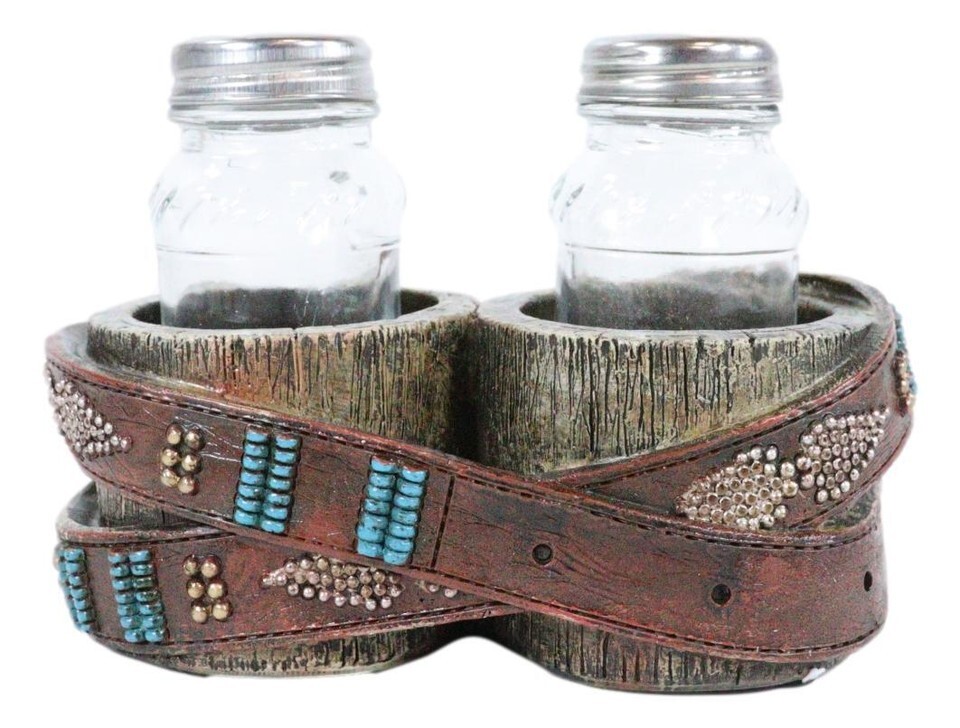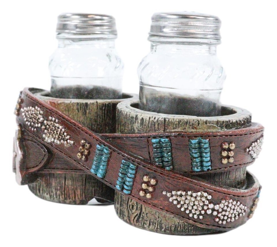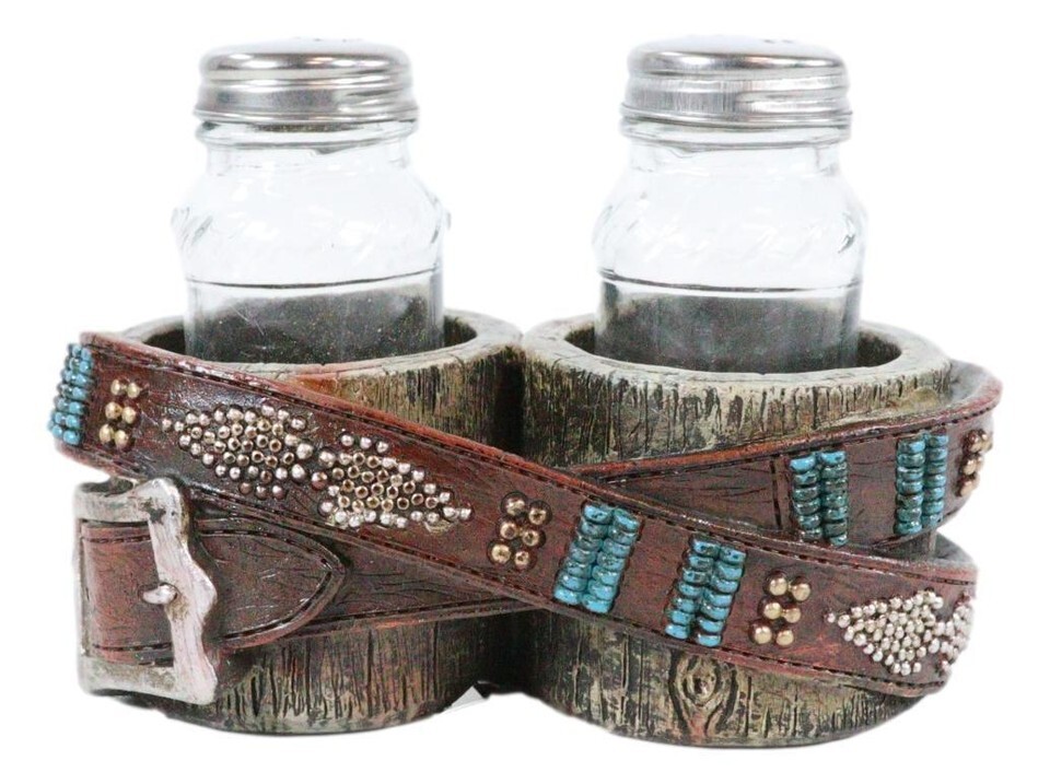 ? This unique southwestern salt pepper shakers holder starts with 2 faux wooden barrels aligned side by side. A faux tooled leather belt buckle is strapped on to them, crossing at the center. The belts are embellished with sculpted beads, hand painted in multi colors.
