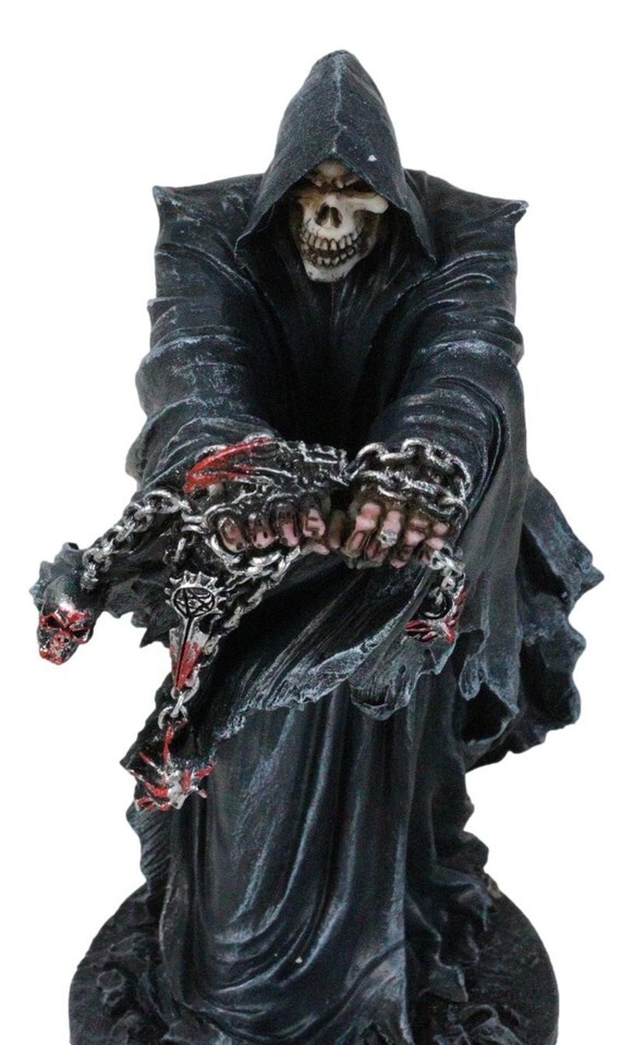 ? Experience the haunting presence of "The Boogeyman" Black Death Grim Reaper. This intricately crafted piece captures the essence of fear and finality, featuring the Grim Reaper adorned with chains and carved knuckles that read 'Game over'. The dark and detailed design adds a macabre touch to your space. Perfect for collectors of gothic and morbid aesthetics, this figurine stands as a foreboding symbol of the end. Let "The Boogeyman" figurine become a stark reminder of our mortality.