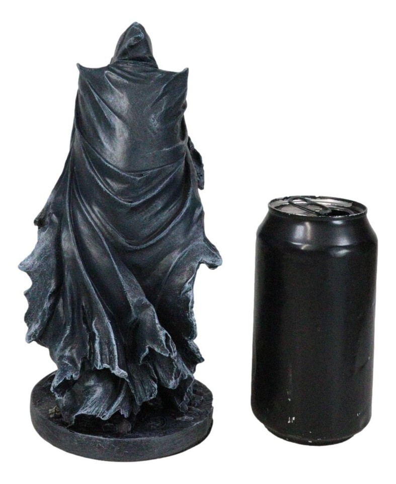 ? This Grim Reaper figurine is 8.5" tall, 6.5" long and 4.25" deep approximately. It weighs about 1.75 pounds.