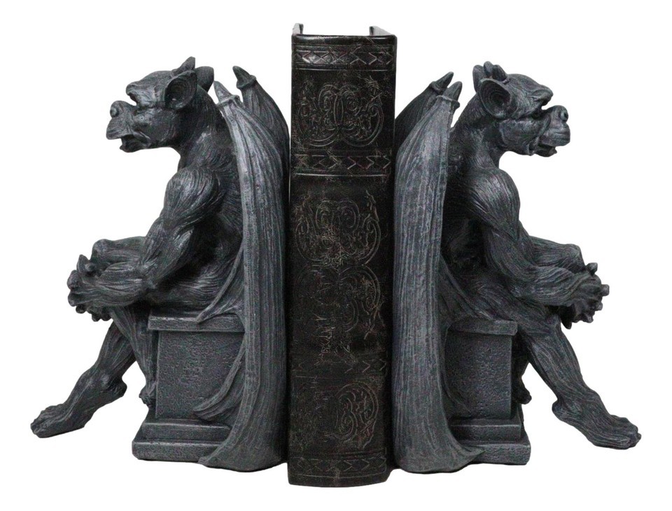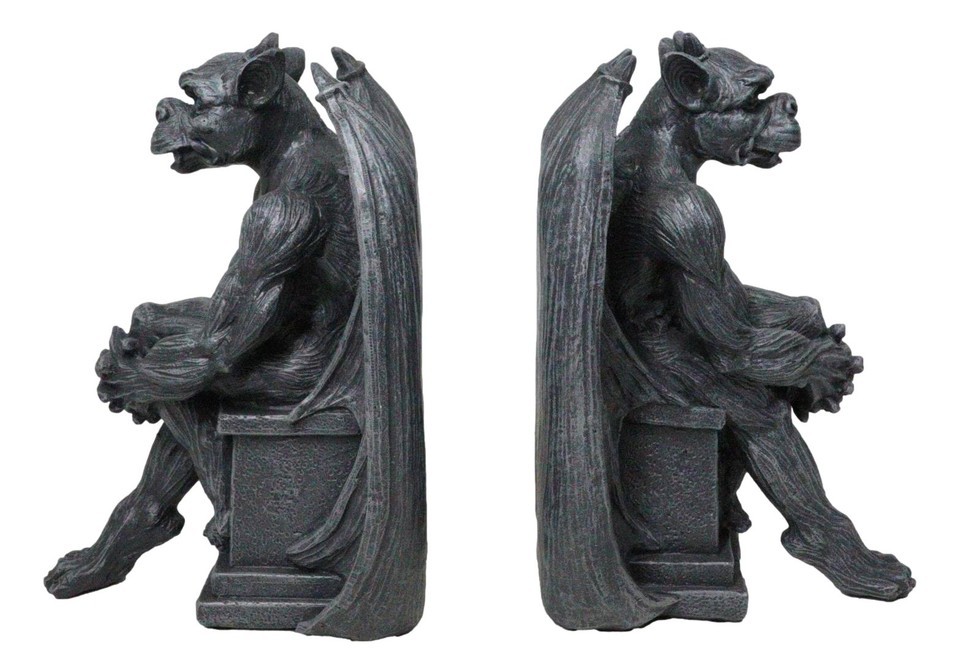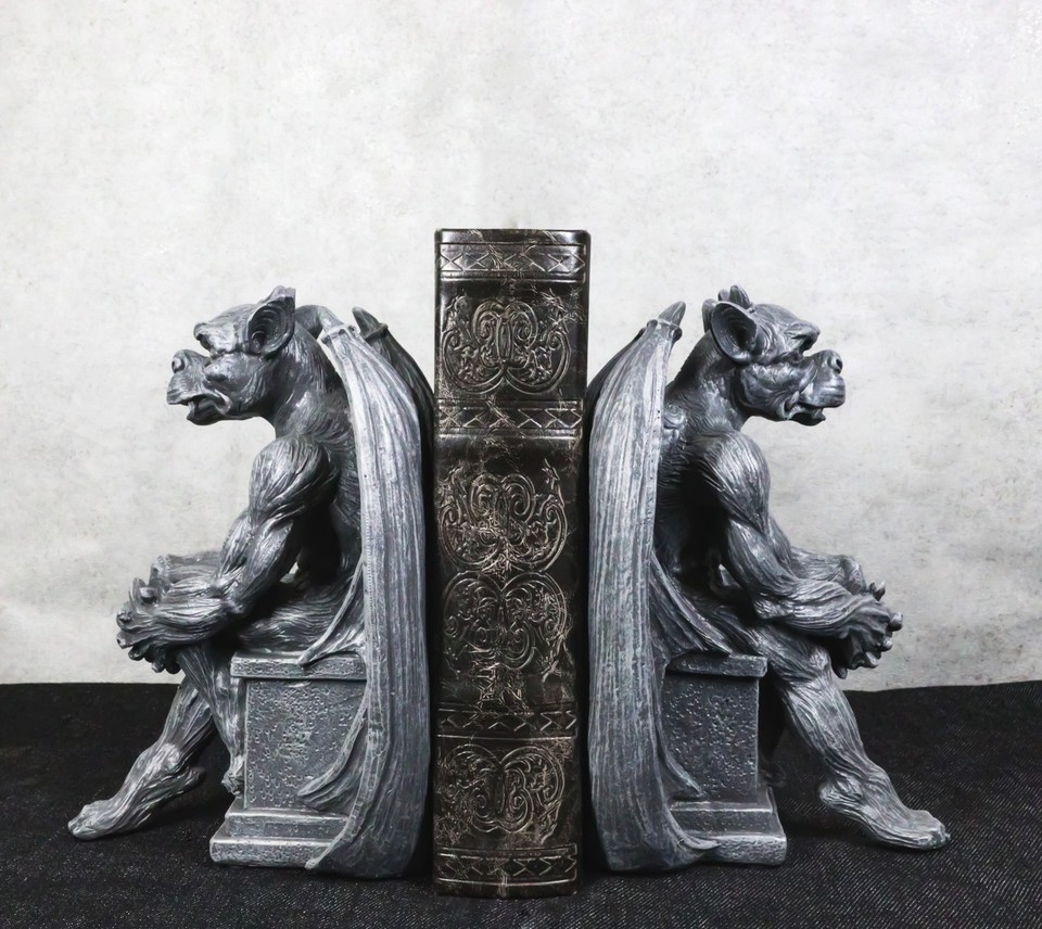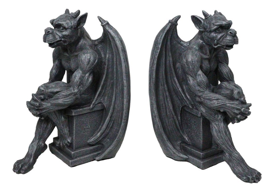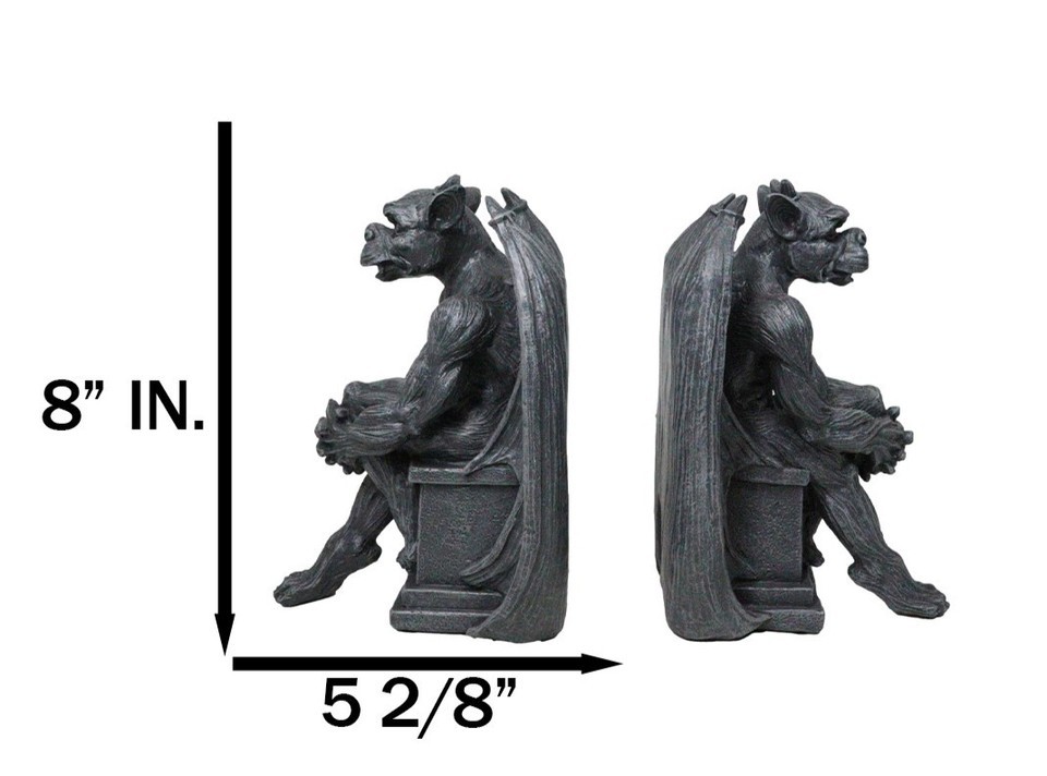 ? This Gargoyle Bookends Set measures 8" High, 5.25" Wide and 5.25" Deep approximately. The set weighs about 4 pounds.