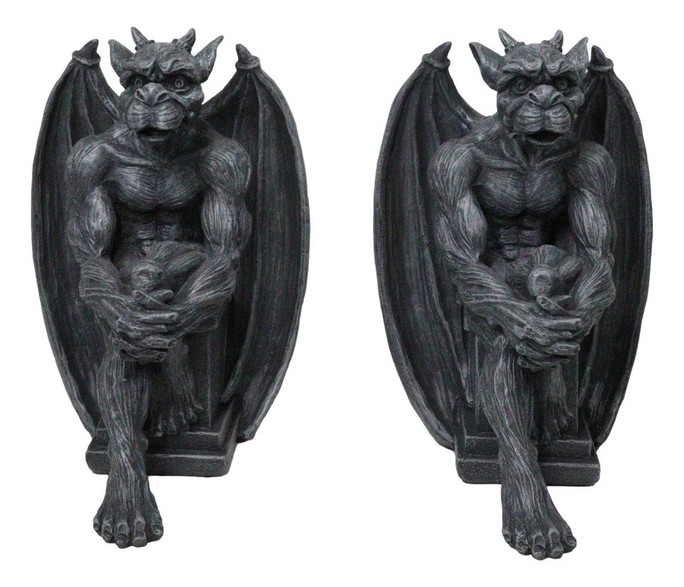 Gothic Warden of The Night Gargoyle Sentries On Pedestals Bookends Figurine Set