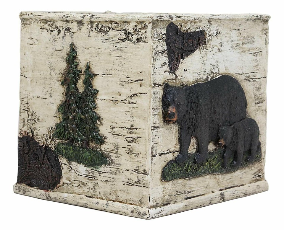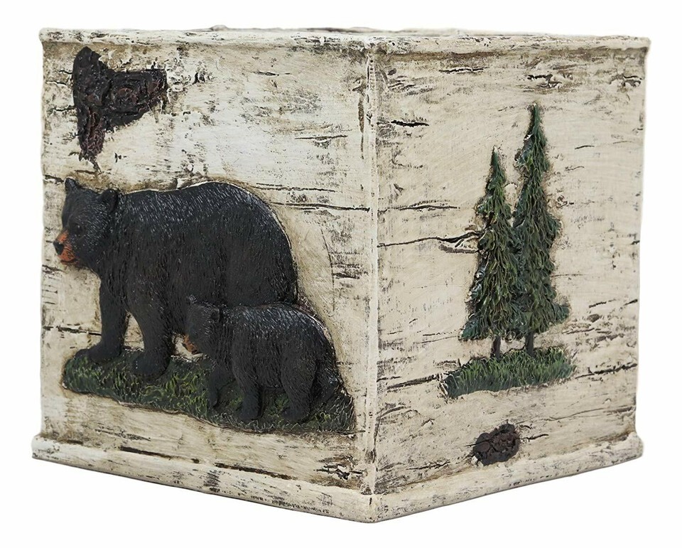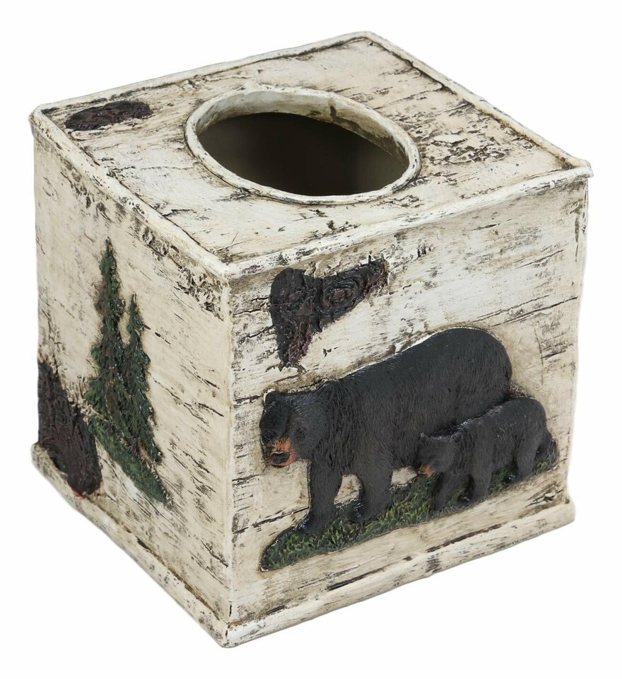 ? Why settle for an ordinary cubic tissue box cover for your rustic bathroom, living room or powder room? You don't have to with this intricately detailed black bear themed figurine featured in rustic textured birch wood finish. Built with quality construction, weighing about 2 pounds, this tissue box cover is un'bear'ably adorable featuring a mother bear with her cub in the pine tree forest.