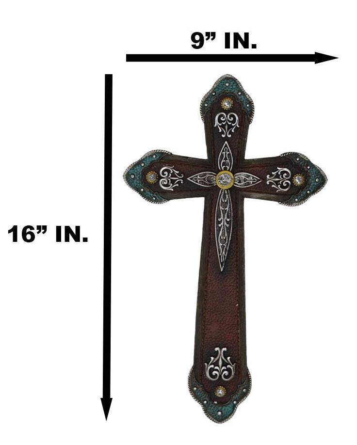 ? This Western Tooled Leather Wall Cross measures 16" High, 9" Wide and 0.5" Thick approximately. It weighs about 2 pounds.