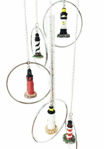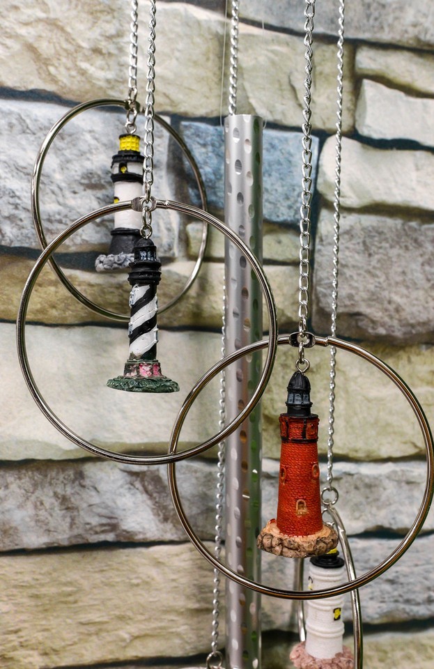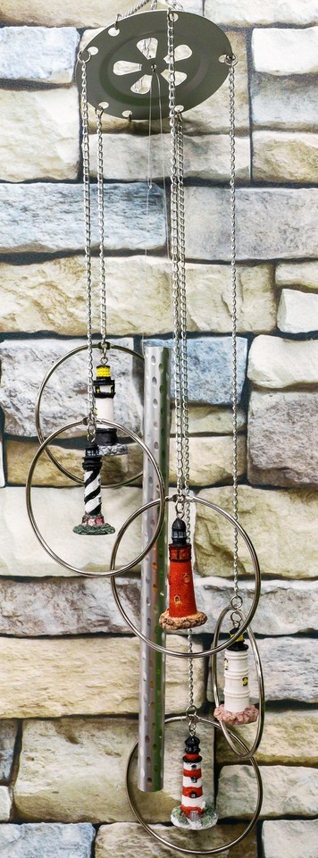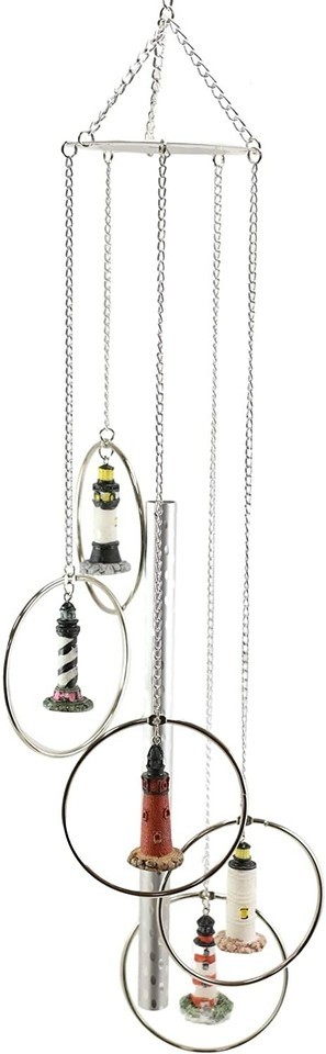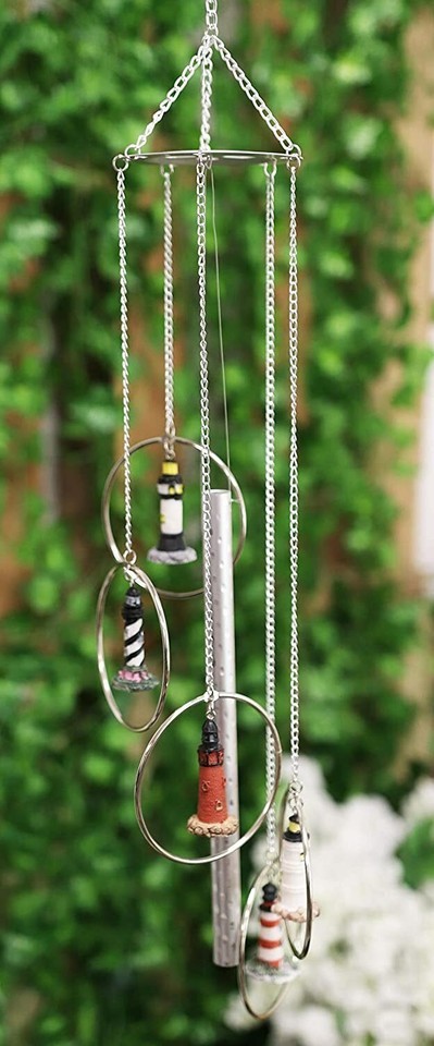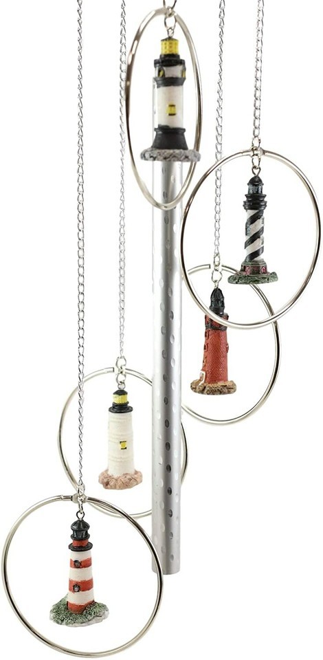 ? Featuring the beautiful scenic Cape Hatteras, Bodie Island, Ponce de Leon Inlet, Cape Foulweather And Biloxi lighthouses individually hung on silver metal rings, we present a wonderful all American landmark lighthouse collection in one wind chime figural. Display it in your patio, garden, and anywhere else to your fancy, this wind chime will make resonant sounds as the wind goes through as well as provide aesthetic beauty to your space.