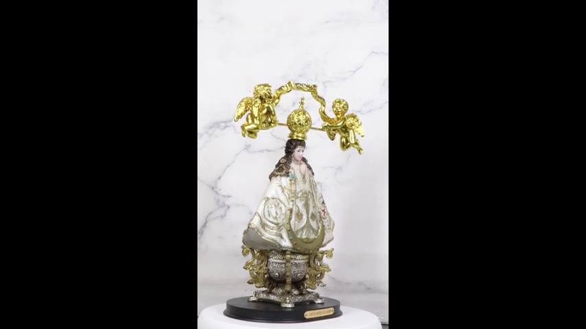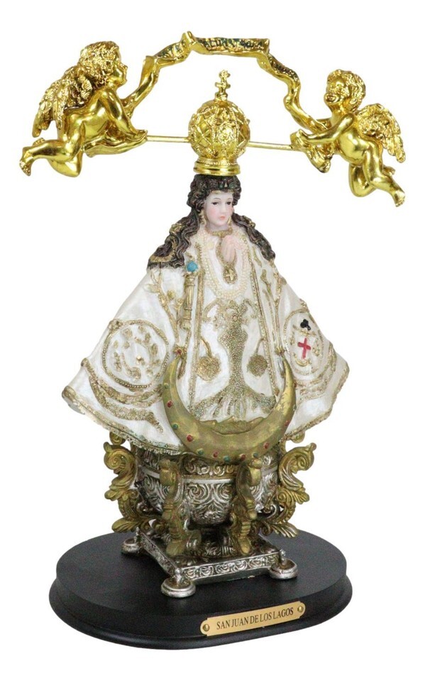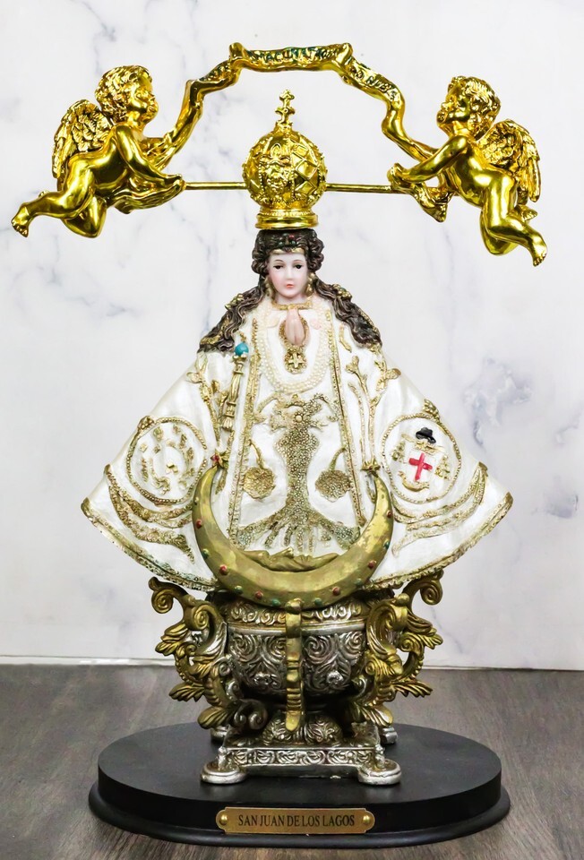 ? Our Lady of San Juan De Los Lagos is adorned with a resplendent golden crown and surrounded by celestial angels carrying a banner. Crafted with utmost reverence, this figurine encapsulates the divine beauty and grace of the revered Virgin Mary. The intricate detailing captures the serenity in her expression, while the radiant golden crown symbolizes her regal presence. Encircled by angelic companions, each delicate wing and ethereal detail adds to the celestial aura of this sacred piece.