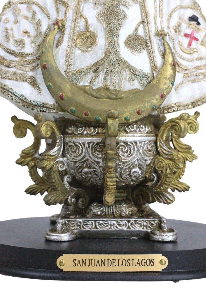 ? Our Lady of San Juan De Los Lagos figurine is made of designer composite resin, hand painted and polished individually. Color tone may vary slightly from pictures.