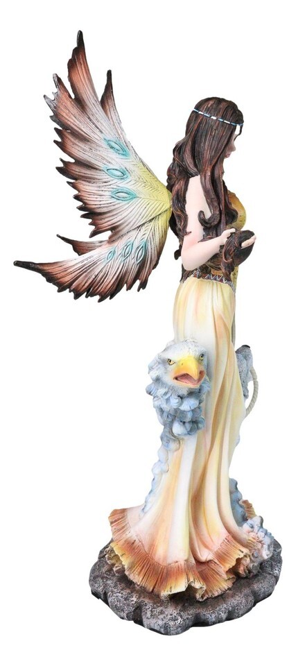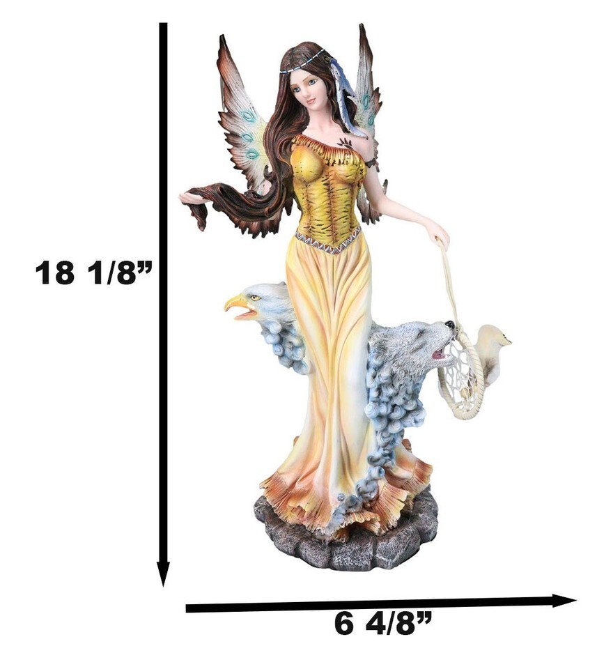 ? Elevate your decor with the Native American Fairy Dreamcatcher Figurine, standing an impressive 18" high. This striking piece features a powerful fairy with detailed wings, holding a dreamcatcher, accented with sculpted clouds, an eagle, and a wolf-symbols of strength, guidance, and intuition. Rich textures and bold artistry bring every element to life, making it a captivating centerpiece for fantasy collectors and lovers of majestic, nature-inspired decor.