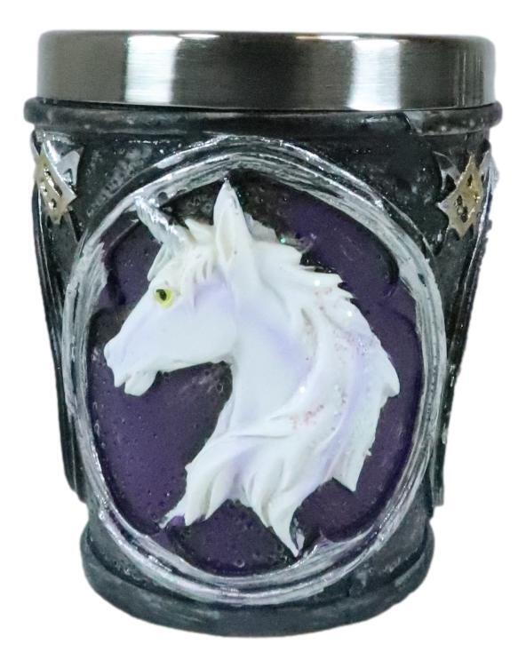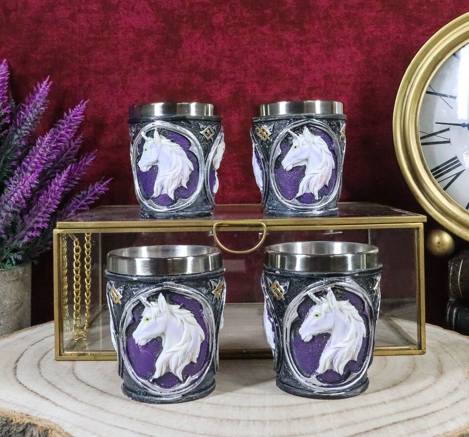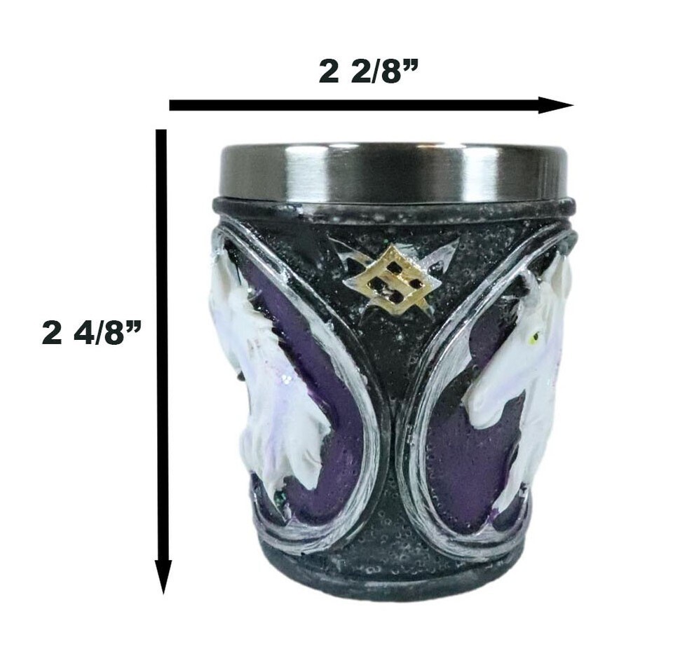 ? These Fantasy Myths And Legends Themed Sacred Unicorn Shot Glasses are made of polyresin, hand painted and polished individually. Each shot Glass is equipped with a stainless steel liner for safe drinking and washing.