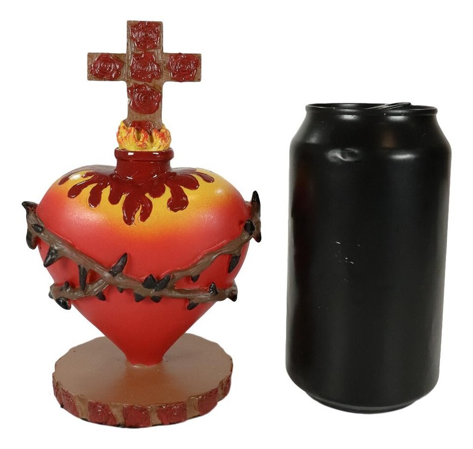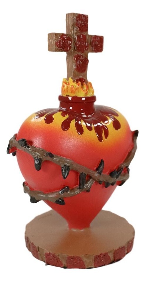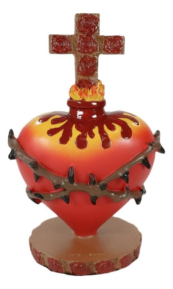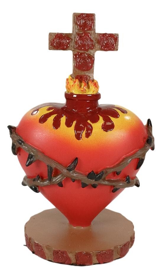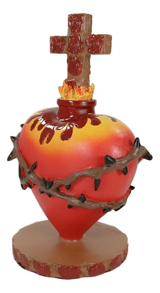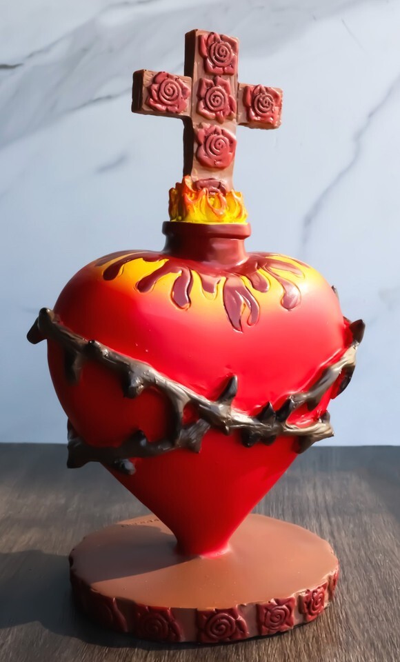 ? The Sacred Heart is one of the most common motifs in religious folk art created in Mexico. The idea is that the physical heart of Jesus is a symbol of his divine love for humanity. This particular sacred heart statuette symbolizes a Red Heart with a crown of thorns of His sufferings, rose of Sharon which symbolizes Jesus Christ himself, and a cross of roses to signify his death on the cross as His ultimate sacrifice for humanity.