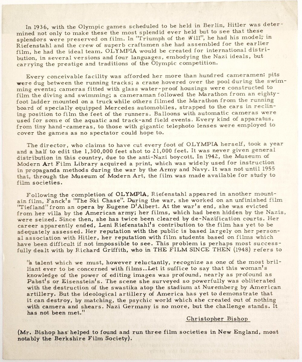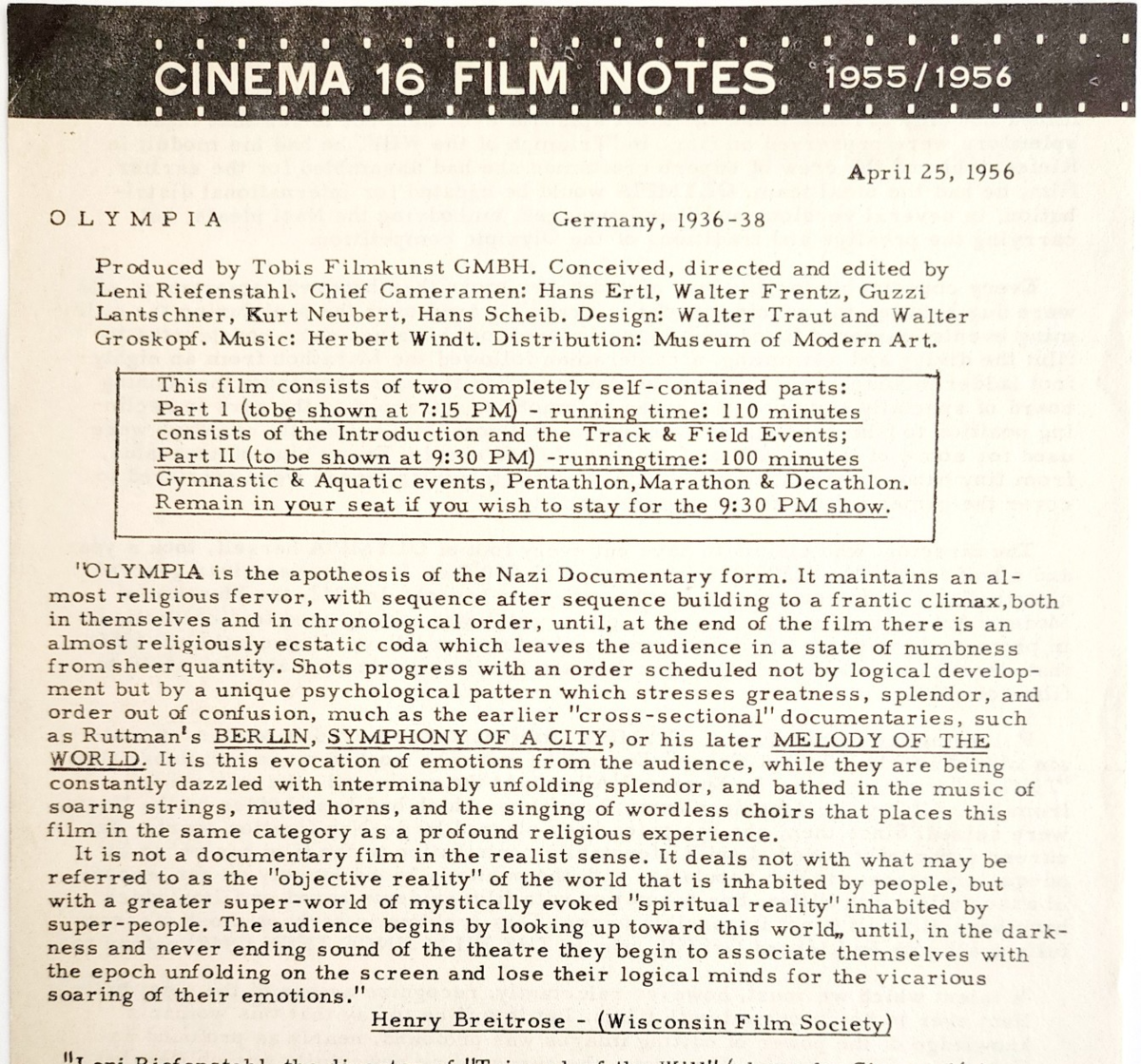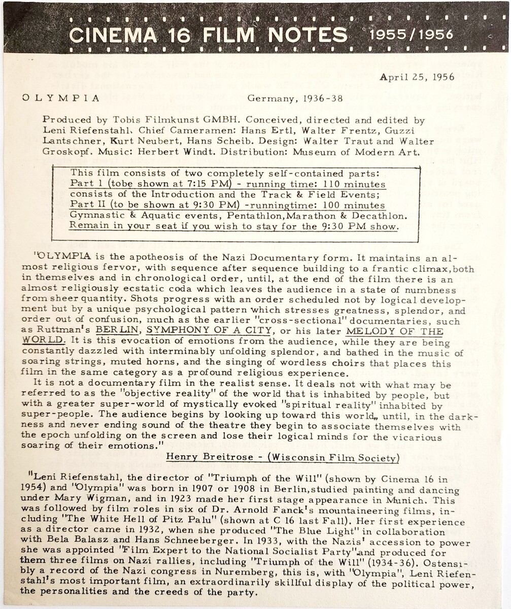 1956 Cinema 16 Film Notes Olympia Riefenstahl WW2 Germany Doc Original 2 C99