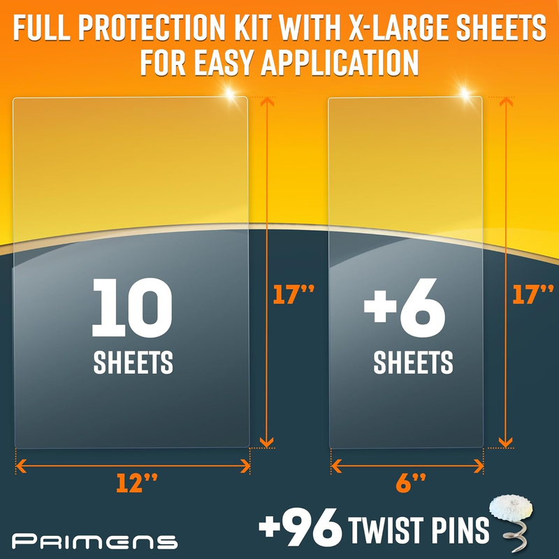 10 X-Large Sheets and 6 Half Sized Sheets in the Pack - You are a busy person and do not have time to do puzzles trying to apply small-sized couch protectors from cats scratching. With Primens X-Large plastic couch sheets that are 17? x 12?, you?ll easily cover half of the armrest with one sheet and add another one if needed. The set comes with 60 pins to reliably secure the protective sheet to the furniture body so that it doesn?t fall off.
