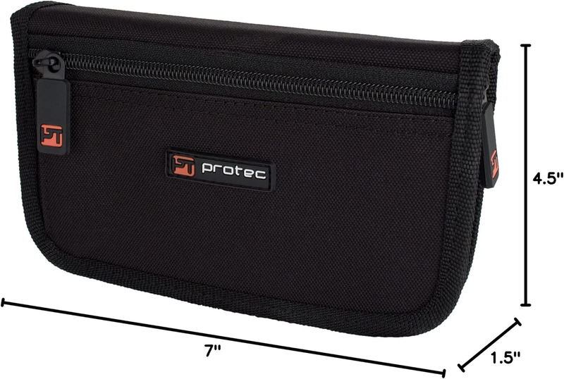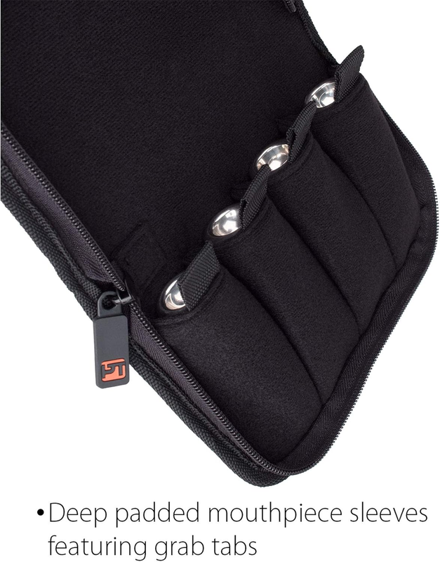 Protec nylon mouthpiece pouches have a simple design. This pouch protects 4 mouthpieces and features full mouthpiece protection, secure zipper closure, softly padded nylex lining, and backside belt loops.