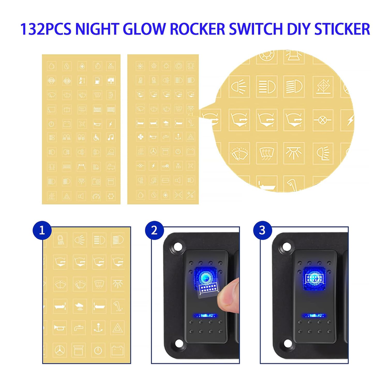 [Premium LED DIY Sticker]: Our rocker switches have 2 blue LEDs, they can illuminate and help you to find the switches in the dark easily, and you still can assign your switches as your needs with the DIY sticker, they will give you a good experience.