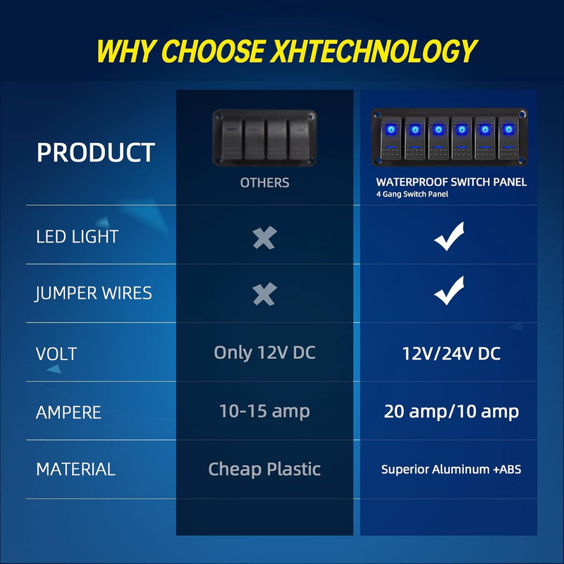 [Waterproof Switches Aluminum Panel]: The item is made of waterproof switches and aluminum panel, which is sturdier and more durable than plastic panel. The item has a unique technology in the waterproof structure. The ultra-thin silicone film prevents water from entering the inside of the switch panel, ensuring the inner cavity is dry, avoiding short circuits, and making the boat rocker switches safer during use.