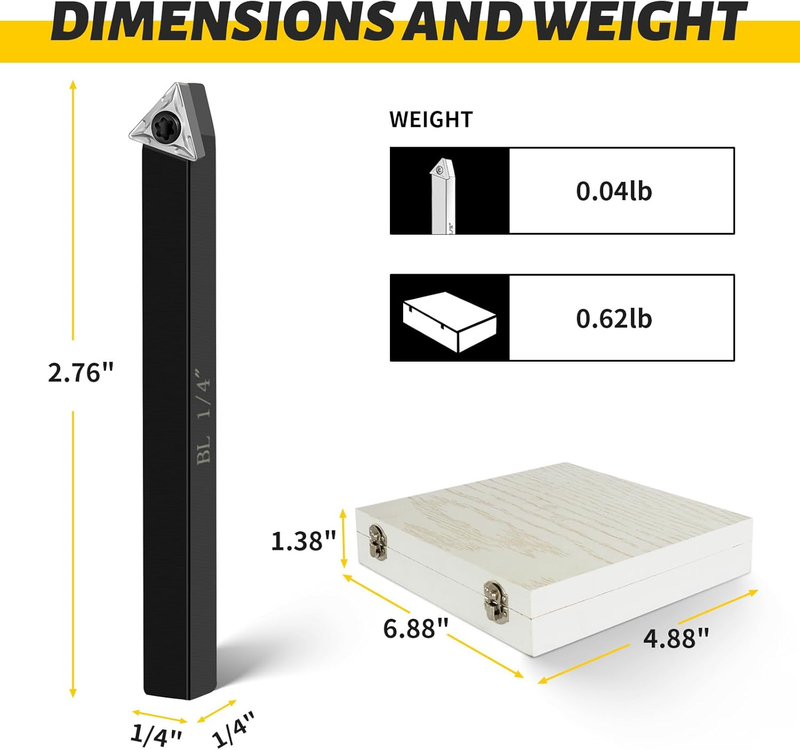 This set includes 5pcs indexable carbide turning tool holder, a wrench, a wooden box for storage, and a spare blade, ready for immediate use.