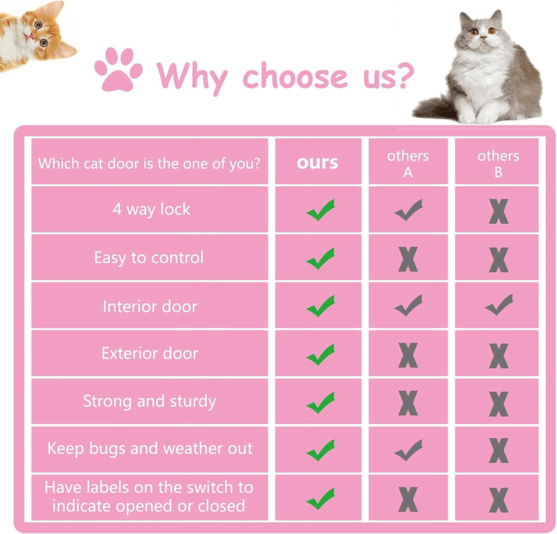 4 Way Locking Mode --- The pet door could be adjusted by the Red and Green switches with tabs to 4 modes: out only, in only, both in and out, and fully locked, easy control of your pet's in and out.