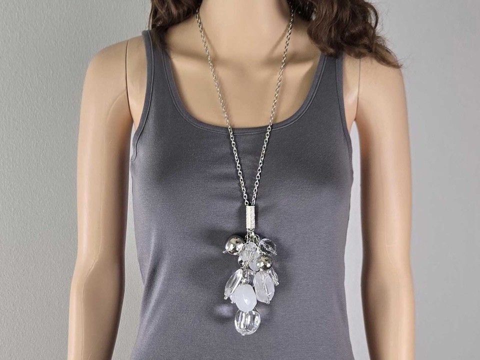 ?Materials: Metal chain, metal silver balls, clear opaque white crystals are formed resin