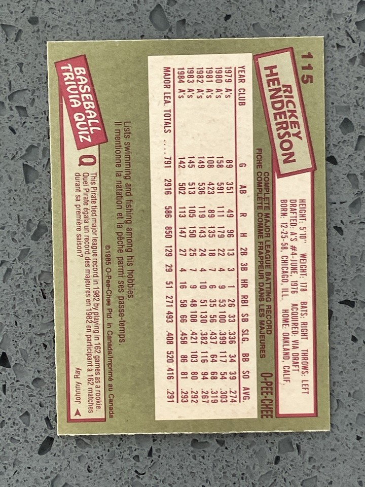 1985 O-Pee-Chee Rickey Henderson #115 1st Yankees Card - 90% Rarer Than Topps B
