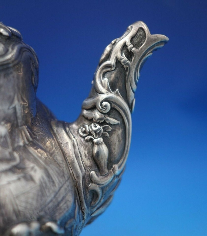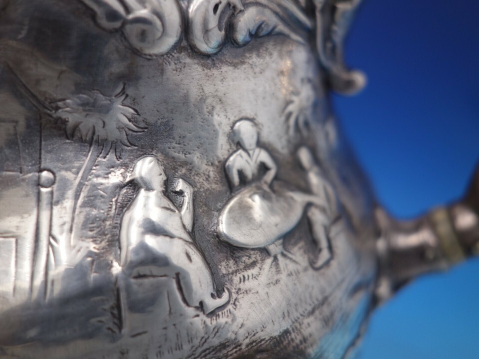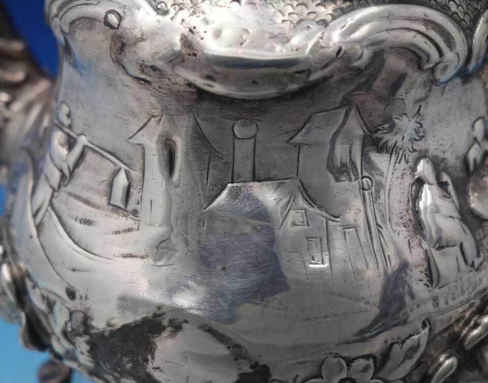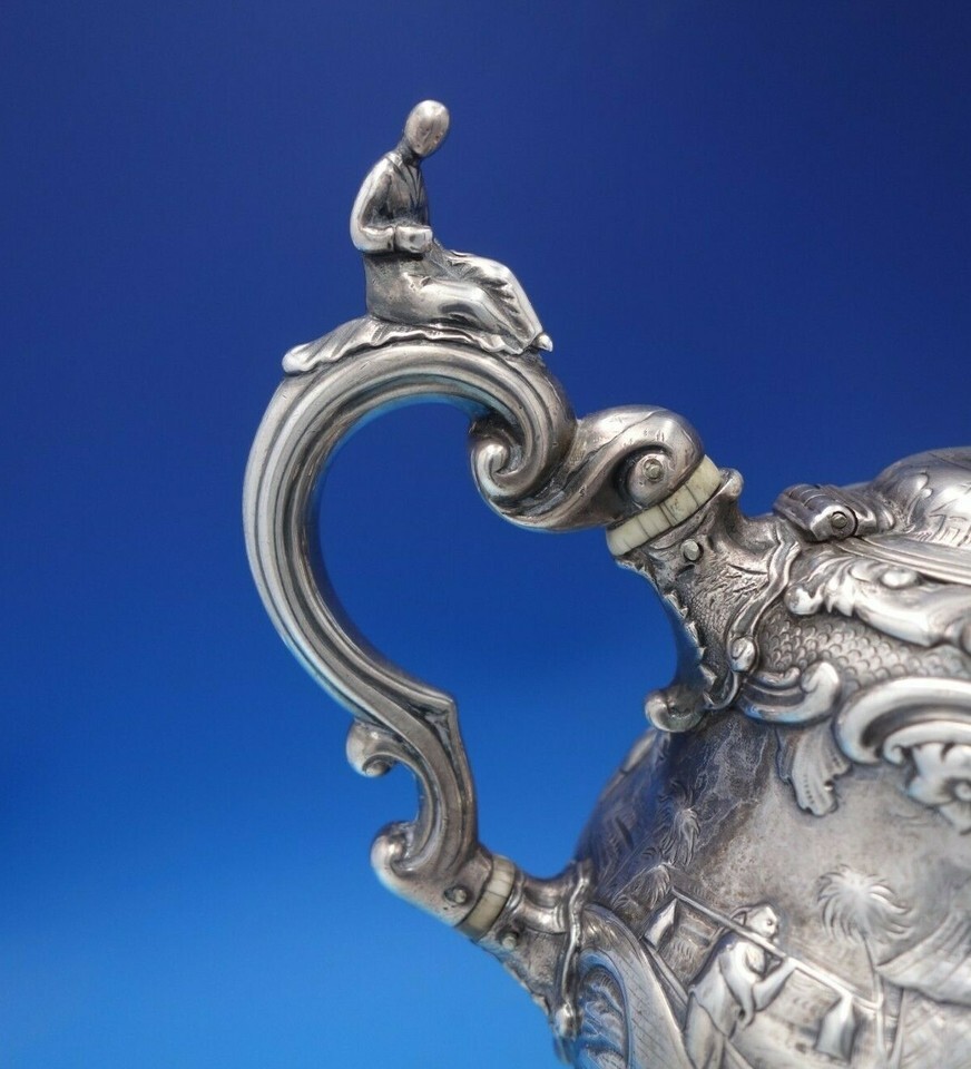 Exceptional Japanesque English Victorian sterling silver tea pot made in London circa 1830-1870 (worn marks/maker unknown). It is hand engraved and chased. This tea pot features a 3-D figural finial and figure on handle and 3-D figural feet (worn and repaired). This piece measures 7" tall x 9 1/2" and weighs 31.21 troy ounces. It is not monogrammed and is in good vintage condition. Extraordinary!