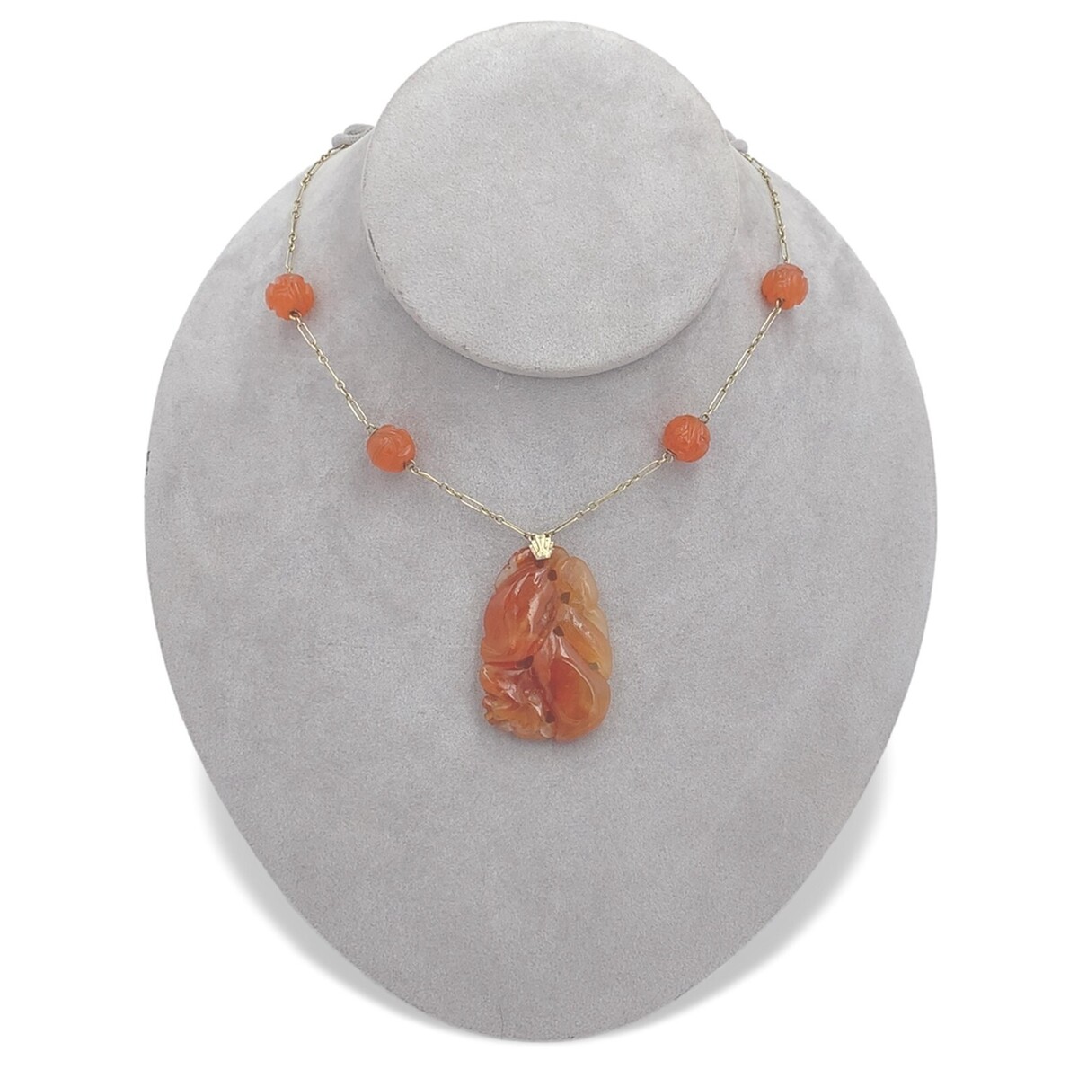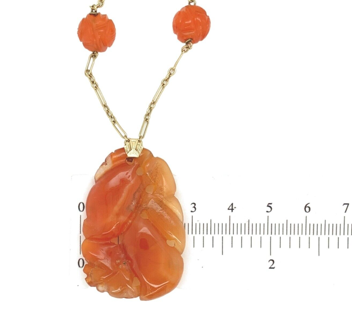 Art Deco 14k yellow gold necklace featuring carved Chinese export carnelian beads and pendant. The original paperclip chain has four faceted carnelian beads measuring 9.5mm. The carved carnelian drop measures about 40mm x 27mm. The pendant is 1 5/8" long, original chain measures 18 3/4" long, and weighs 11.71 dwt. It dates from the 1920s. Terrific!