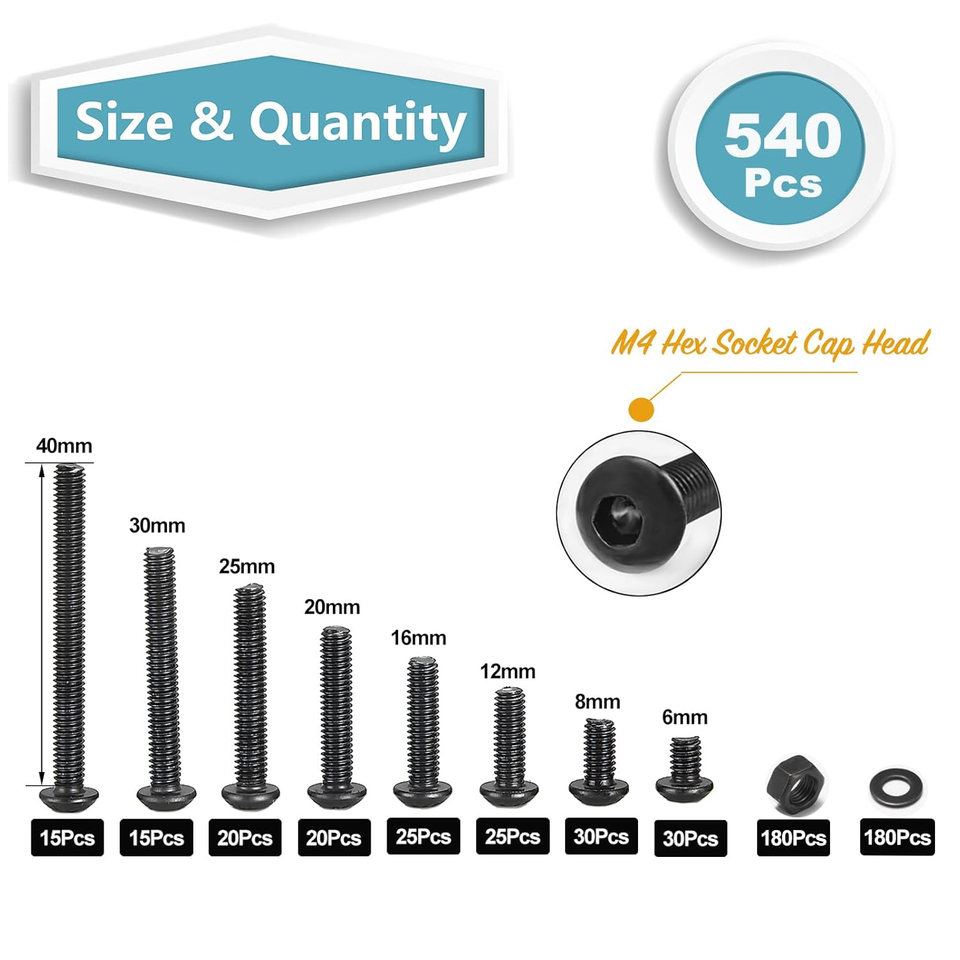 540PCS M4 Metric Screws Nuts Washers Kit, M4x6-40mm Hex Button Head Bolts