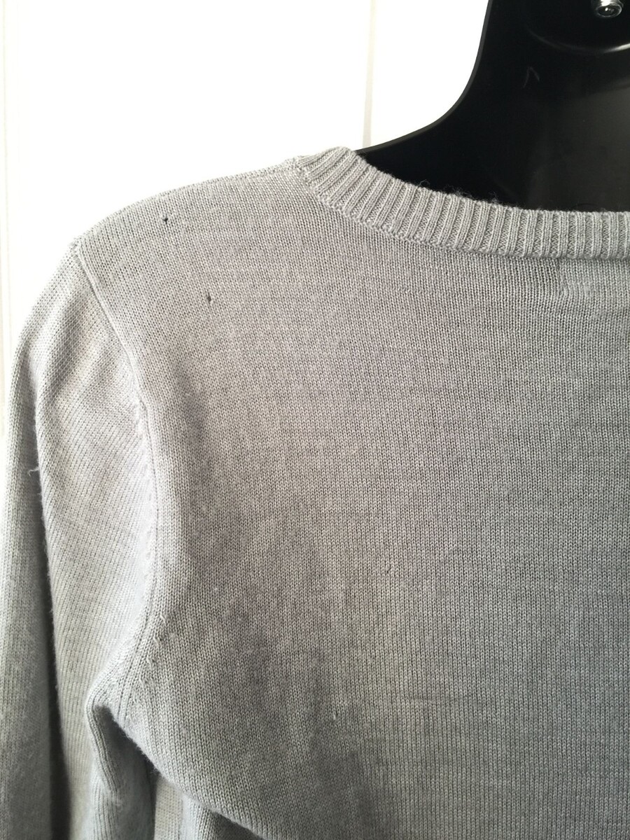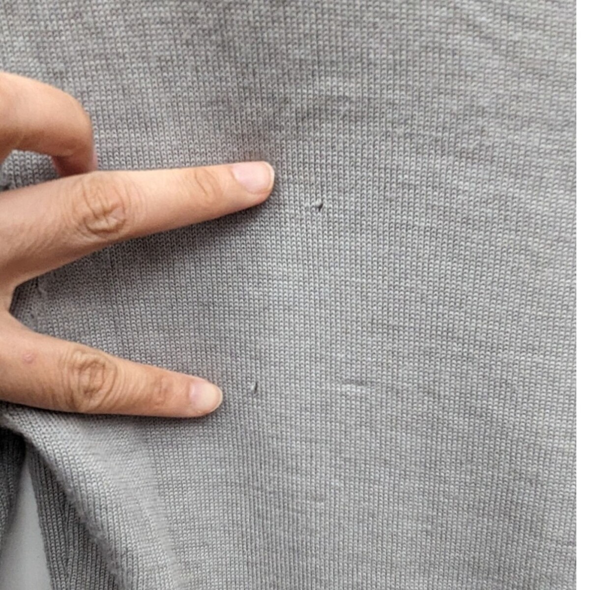 Gently pre-owned in very good condition, except for a few small holes on the back as shown. See photos for details. Otherwise, soft and clean. Sold as is.