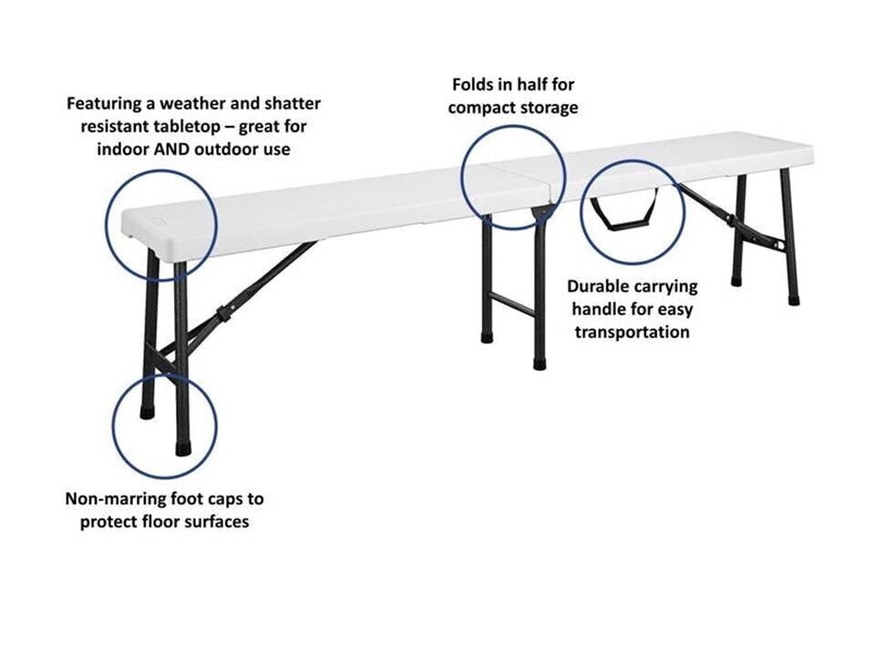 The Cosco 14-419-WSP2 Casual Folding Bench delivers reliable, space-saving seating for indoor and outdoor use. Spanning 72 inches wide, it comfortably accommodates multiple guests and supports up to 500 lbs thanks to its reinforced black steel frame. The white weather-resistant resin seat resists spills, UV fading, and moisture, while non-marring foot caps protect floors from scratches. Designed with a center-fold mechanism and integrated carrying handle, it folds flat for effortless transport and compact storage?ideal for patios, game rooms, holiday gatherings, or backyard barbecues.