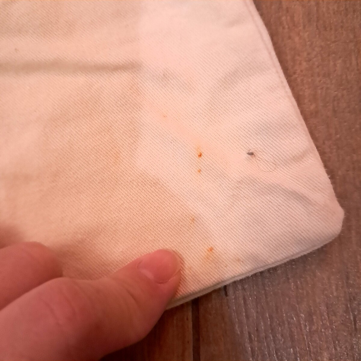 Cream with black design. Drawstring. Some spots/discoloration as shown. See pics.