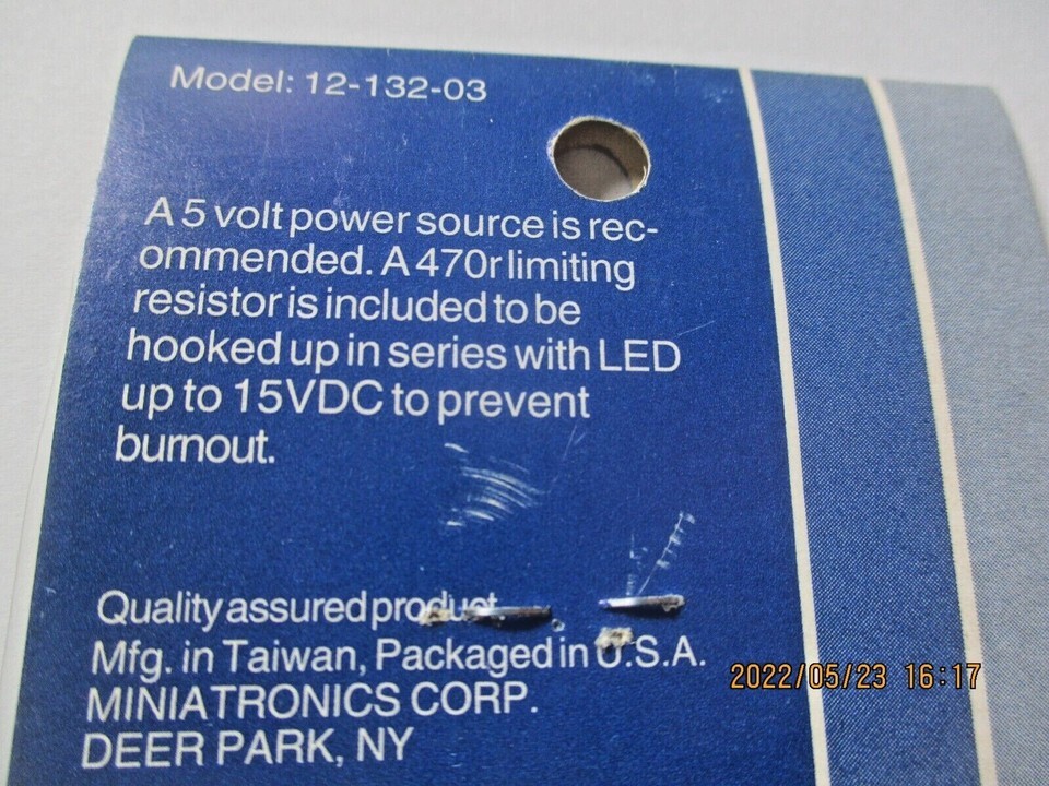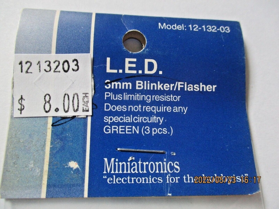 Miniatronics L.E.D. 3mm Blinker Green. 3 Pieces. HO-Scale. A 5 Volt power source is recommended. A 470-ohm resistor is included to be hooked up in series with LED up to 15 VDC to prevent burnout.