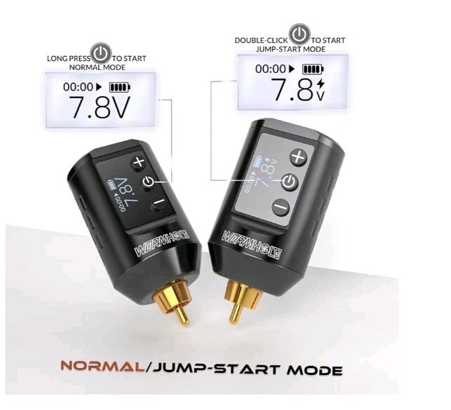 Jumpstart Mode - This wireless tattoo power battery pack is equipped with a jump-start function. In the jumpstart mode, it will start at 10V, and then load to the last memory working voltage in this mode. This function is suitable for tattoo pens that require high-voltage start-up