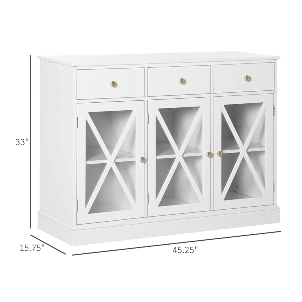 - Color: White - Material: MDF, Glass - Overall Dimensions: 45.25"W x 15.75"D x 33"H - Storage Cabinet Inner: 14"W x 13.75"D x 22.25"H - Drawer Inner: 12"W x 13.25"D x 3.25"H - Weight Capacity: 110lbs (whole), 11lbs (Shelf), 33lbs (top)