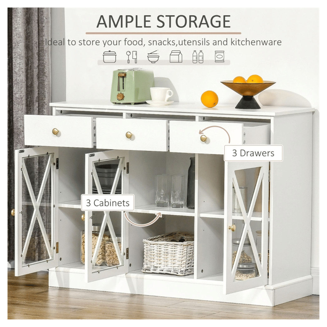 - Farmhouse style furniture evokes a cottage charm in your home - Framed glass doors allow you to display decorative keepsakes - 3 drawers and an enclosed cabinet provide ample storage - Built-in adjustable shelves make it easy to customize the space - Can be used as a buffet, storage cabinet and TV console - Made of MDF and glass - Features anti-topple straps and can be fixed to the wall for safety - Assembly required