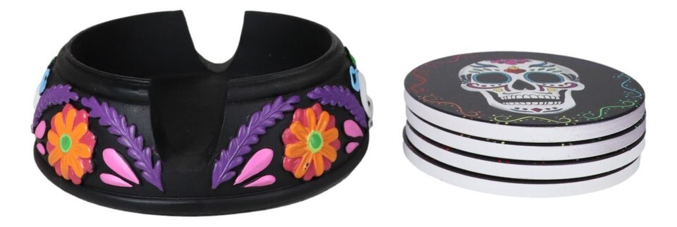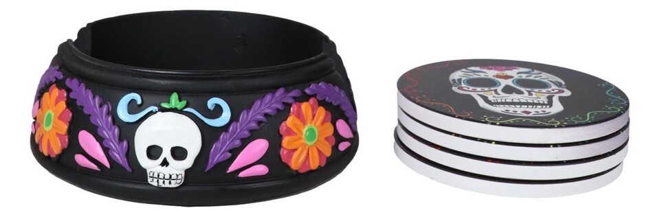 ? You will get the tribal skull holder and 4 sugar skull coasters as pictured. Each coaster is 4.25" in Diameter, and are made of ceramic with cork backing.