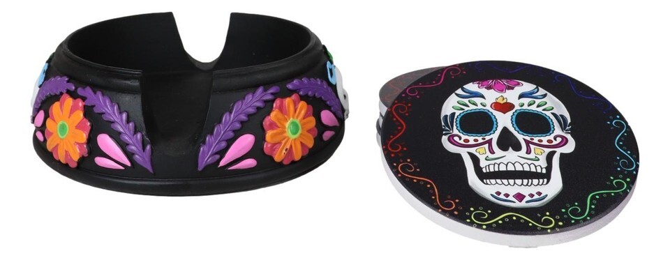 ? Protect your furniture with this bizarre coaster set featuring tribal etched tooled skulls as the focal point of the coaster holder. Ornate with the sugar skull day of the dead floral patterns, the skull base is painted in lively colors against a black backdrop. The coasters feature sublimed images of a sugar skull face surrounded by colorful knotworks.