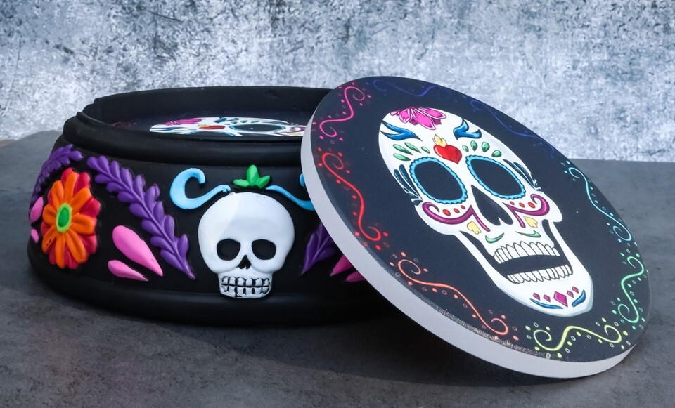 ? This Sugar Skull Floral Tattoo Coaster Set is made of designer composite resin, hand painted and polished individually.