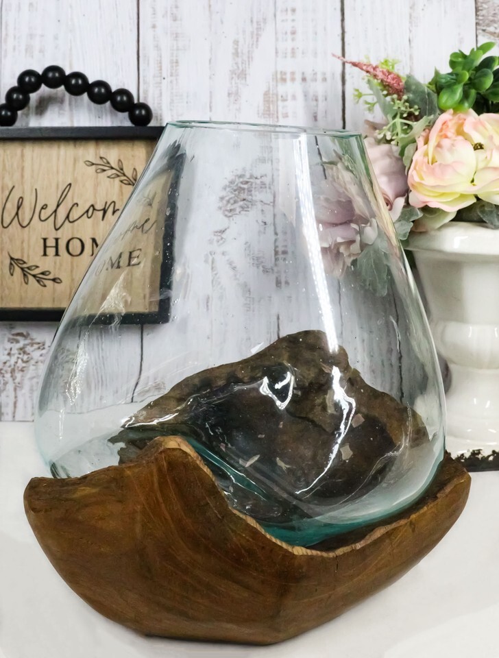 Ebros Balinese Handicraft Natural Driftwood With Fitted Hand Blown Glass Bowl 8.5"H